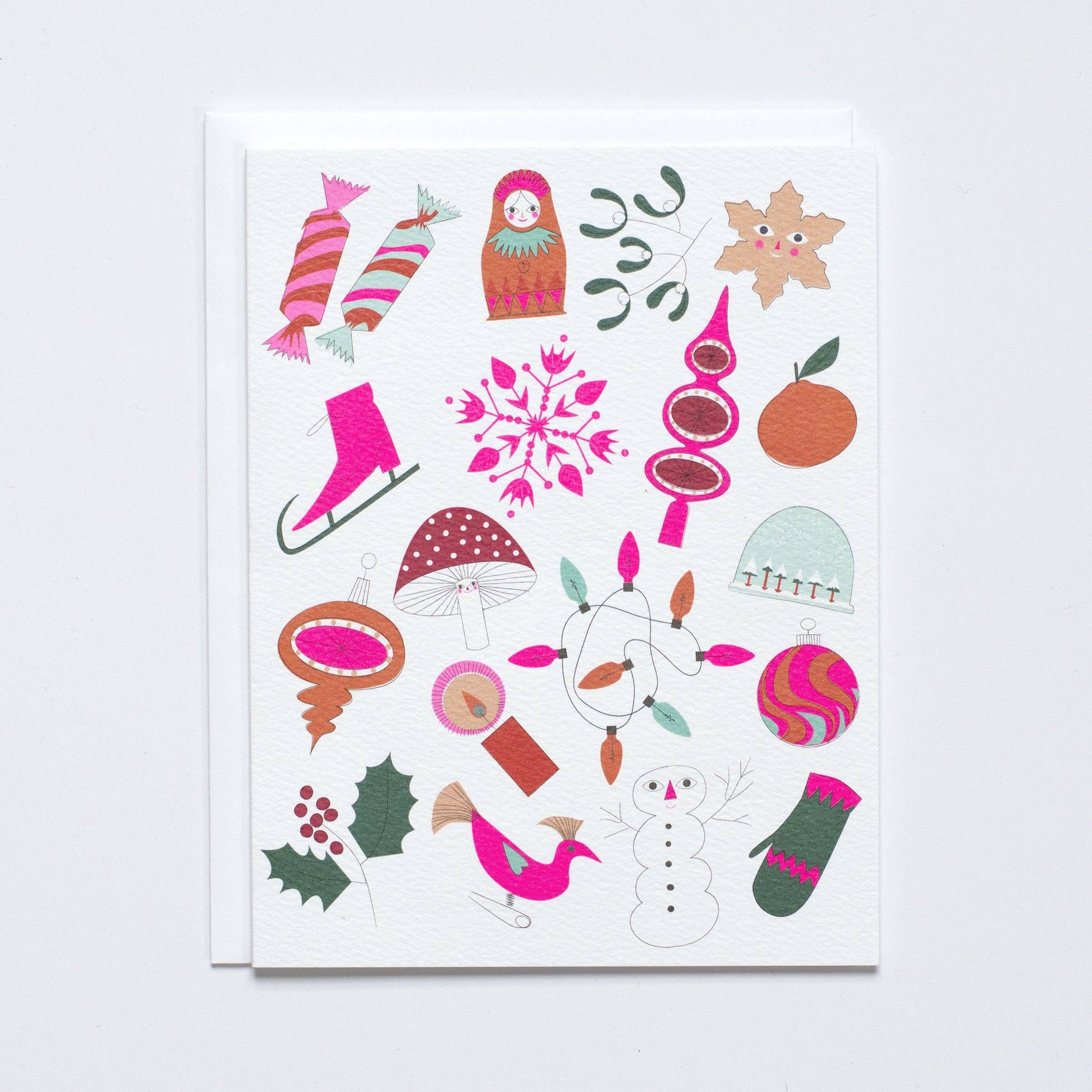 Vintage glass bobbles, neon bright snowflakes, mistletoe and Christmas crackers are just a few of the sweet holiday ornaments on this very merry card.