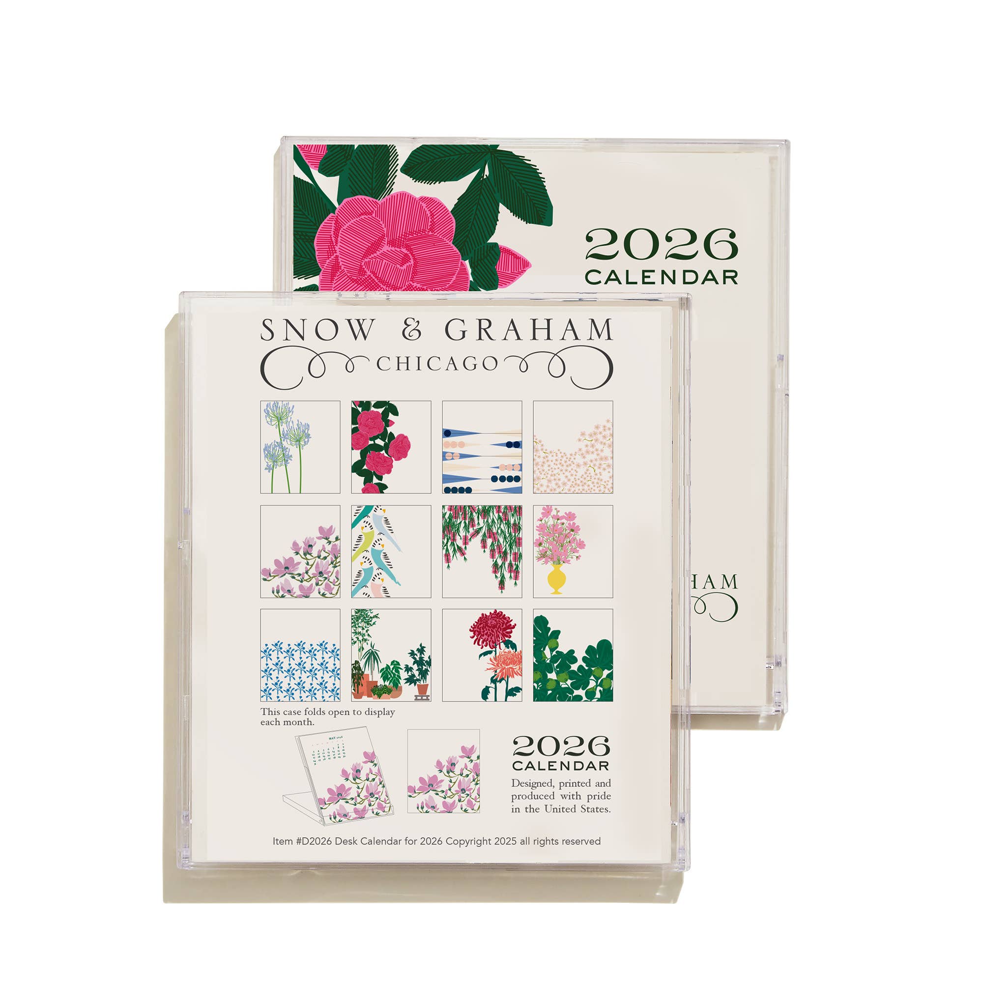 A perennial favorite, our desk calendar pairs a signature Snow & Graham design with each month of the year. This image is carried to the back of each card, making it a frameable work of art when the year is through. Packed in a sturdy jewel case that doubles as a stand. 12 month calendar for 2026 Artwork is carried from front to back of card Jewel case stand 5.5 x 5 inches Printed in full color on heavyweight stock