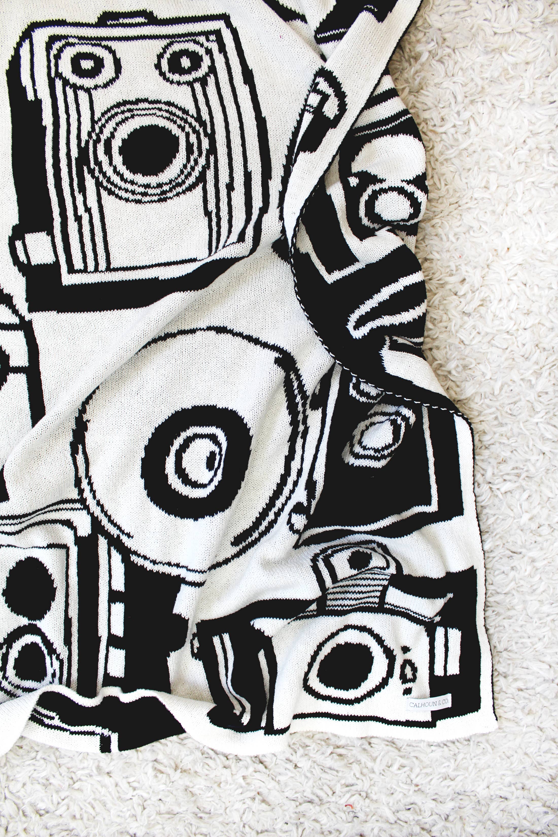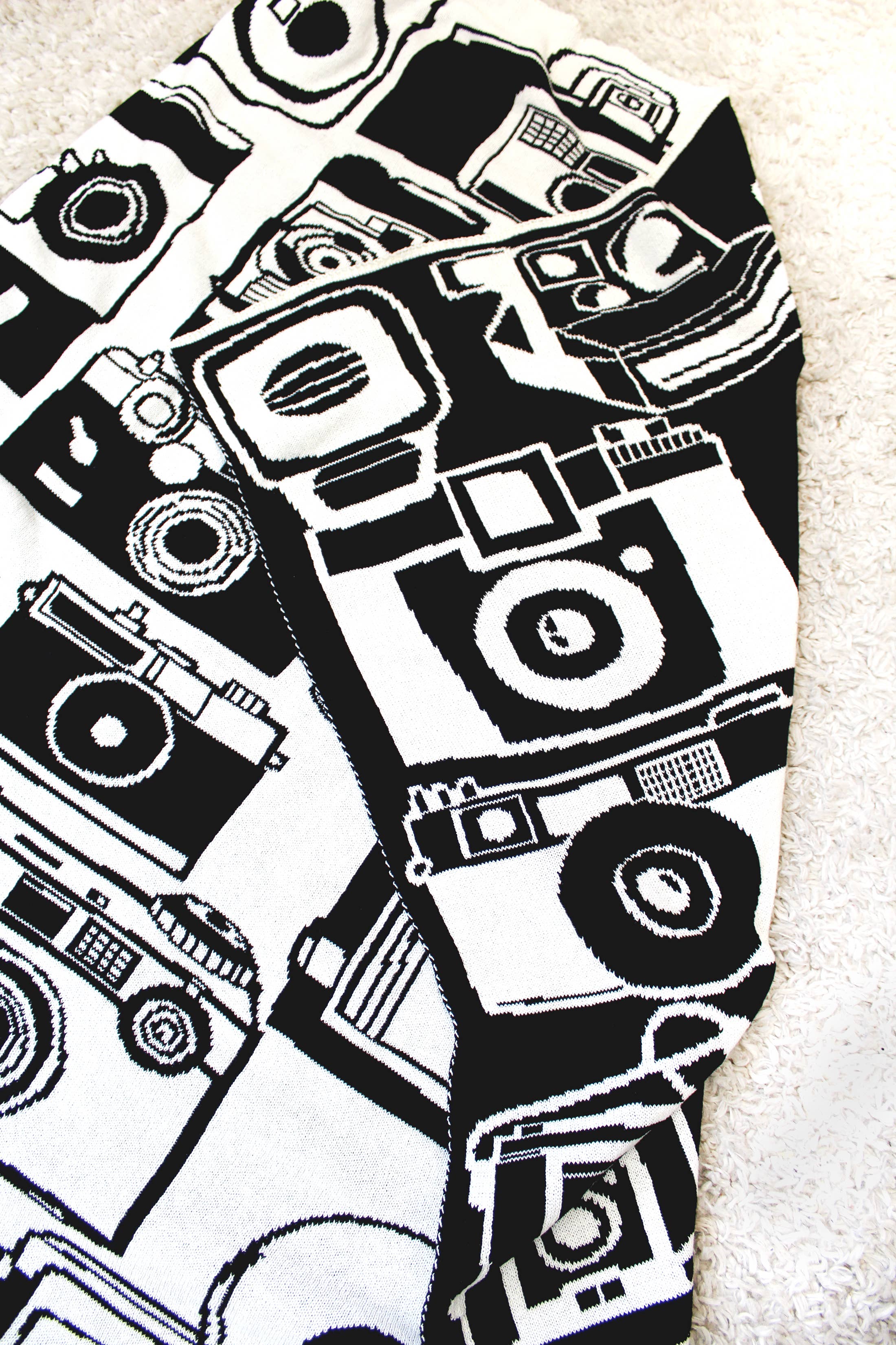 Black & white vintage camera throw blanket. Makes the perfect gift for your photographer friend, or simply your very photogenic self. Selfies have never been cozier. Artist Kerry Stokes creates fun and happy throws with a little humor and a whole lot of color. Your couch has never been cozier.