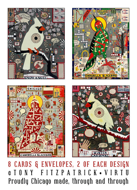 {"id":10293244690743,"title":"Box of Snowbirds, set of 8 cards and envelopes","handle":"box-of-snowbirds","description":"\u003cp\u003e \u003c\/p\u003e\n\u003cp\u003eA box of birds for your holiday sentiments? We love this as a gift for the collector, the birder, the naturalist and just because.\u003c\/p\u003e\n\u003cp\u003eArtist, poet, actor, writer Tony Fitzpatrick is, perhaps, Chicago's greatest storyteller. An avid birder, he has produced hundreds of etchings and collages of the avian nature, these from the Songbird series of mixed media collage.\u003cbr\u003e\u003c\/p\u003e\n\u003cp\u003eVirtu is honored to have been asked to collaborate with our beloved Bucktown neighbor for this project.\u003c\/p\u003e\n\u003cul\u003e\n\u003cli\u003e4.5” x 6.25”, a larger size to capture every striking detail\u003c\/li\u003e\n\u003cli\u003eBright white paper with a red envelope\u003cbr\u003e\n\u003c\/li\u003e\n\u003cli\u003eBlank interior for your personal message\u003c\/li\u003e\n\u003cli\u003eBox of 8 cards and envelopes, 2 of each design\u003c\/li\u003e\n\u003cli\u003eCreated, designed, printed and assembled right here in Chicago\u003c\/li\u003e\n\u003c\/ul\u003e","published_at":"2025-10-03T11:48:52-05:00","created_at":"2025-10-03T11:36:28-05:00","vendor":"Tony Fitzpatrick","type":"Card","tags":["Boxed Cards","Card","Chicago Made","Holiday Card"],"price":3000,"price_min":3000,"price_max":3000,"available":true,"price_varies":false,"compare_at_price":0,"compare_at_price_min":0,"compare_at_price_max":0,"compare_at_price_varies":false,"variants":[{"id":51164232122679,"title":"Default Title","option1":"Default Title","option2":null,"option3":null,"sku":"TFHOLX","requires_shipping":true,"taxable":true,"featured_image":null,"available":true,"name":"Box of Snowbirds, set of 8 cards and envelopes","public_title":null,"options":["Default Title"],"price":3000,"weight":113,"compare_at_price":0,"inventory_quantity":30,"inventory_management":"shopify","inventory_policy":"continue","barcode":null,"requires_selling_plan":false,"selling_plan_allocations":[]}],"images":["\/\/www.virtuforyou.com\/cdn\/shop\/files\/TonyInsert.jpg?v=1759510133","\/\/www.virtuforyou.com\/cdn\/shop\/files\/519462737_10161874422531452_25321458872867258_n.jpg?v=1759510133","\/\/www.virtuforyou.com\/cdn\/shop\/files\/510603733_10161721377001452_960557360232725637_n.jpg?v=1759510133","\/\/www.virtuforyou.com\/cdn\/shop\/files\/518279639_10161861711806452_367511253214462262_n.jpg?v=1759510133","\/\/www.virtuforyou.com\/cdn\/shop\/files\/Cinderella_Blackbird_300DPI_1.jpg?v=1759510133","\/\/www.virtuforyou.com\/cdn\/shop\/files\/IMG_9036.jpg?v=1759510053"],"featured_image":"\/\/www.virtuforyou.com\/cdn\/shop\/files\/TonyInsert.jpg?v=1759510133","options":["Title"],"media":[{"alt":null,"id":42319946744119,"position":1,"preview_image":{"aspect_ratio":0.72,"height":3750,"width":2700,"src":"\/\/www.virtuforyou.com\/cdn\/shop\/files\/TonyInsert.jpg?v=1759510133"},"aspect_ratio":0.72,"height":3750,"media_type":"image","src":"\/\/www.virtuforyou.com\/cdn\/shop\/files\/TonyInsert.jpg?v=1759510133","width":2700},{"alt":null,"id":42319946678583,"position":2,"preview_image":{"aspect_ratio":0.8,"height":2048,"width":1638,"src":"\/\/www.virtuforyou.com\/cdn\/shop\/files\/519462737_10161874422531452_25321458872867258_n.jpg?v=1759510133"},"aspect_ratio":0.8,"height":2048,"media_type":"image","src":"\/\/www.virtuforyou.com\/cdn\/shop\/files\/519462737_10161874422531452_25321458872867258_n.jpg?v=1759510133","width":1638},{"alt":null,"id":42319948415287,"position":3,"preview_image":{"aspect_ratio":0.803,"height":960,"width":771,"src":"\/\/www.virtuforyou.com\/cdn\/shop\/files\/510603733_10161721377001452_960557360232725637_n.jpg?v=1759510133"},"aspect_ratio":0.803,"height":960,"media_type":"image","src":"\/\/www.virtuforyou.com\/cdn\/shop\/files\/510603733_10161721377001452_960557360232725637_n.jpg?v=1759510133","width":771},{"alt":null,"id":42319946645815,"position":4,"preview_image":{"aspect_ratio":0.8,"height":960,"width":768,"src":"\/\/www.virtuforyou.com\/cdn\/shop\/files\/518279639_10161861711806452_367511253214462262_n.jpg?v=1759510133"},"aspect_ratio":0.8,"height":960,"media_type":"image","src":"\/\/www.virtuforyou.com\/cdn\/shop\/files\/518279639_10161861711806452_367511253214462262_n.jpg?v=1759510133","width":768},{"alt":null,"id":42319946711351,"position":5,"preview_image":{"aspect_ratio":0.779,"height":3849,"width":3000,"src":"\/\/www.virtuforyou.com\/cdn\/shop\/files\/Cinderella_Blackbird_300DPI_1.jpg?v=1759510133"},"aspect_ratio":0.779,"height":3849,"media_type":"image","src":"\/\/www.virtuforyou.com\/cdn\/shop\/files\/Cinderella_Blackbird_300DPI_1.jpg?v=1759510133","width":3000},{"alt":null,"id":42319969616183,"position":6,"preview_image":{"aspect_ratio":0.75,"height":2016,"width":1512,"src":"\/\/www.virtuforyou.com\/cdn\/shop\/files\/IMG_9036.jpg?v=1759510053"},"aspect_ratio":0.75,"height":2016,"media_type":"image","src":"\/\/www.virtuforyou.com\/cdn\/shop\/files\/IMG_9036.jpg?v=1759510053","width":1512}],"requires_selling_plan":false,"selling_plan_groups":[],"content":"\u003cp\u003e \u003c\/p\u003e\n\u003cp\u003eA box of birds for your holiday sentiments? We love this as a gift for the collector, the birder, the naturalist and just because.\u003c\/p\u003e\n\u003cp\u003eArtist, poet, actor, writer Tony Fitzpatrick is, perhaps, Chicago's greatest storyteller. An avid birder, he has produced hundreds of etchings and collages of the avian nature, these from the Songbird series of mixed media collage.\u003cbr\u003e\u003c\/p\u003e\n\u003cp\u003eVirtu is honored to have been asked to collaborate with our beloved Bucktown neighbor for this project.\u003c\/p\u003e\n\u003cul\u003e\n\u003cli\u003e4.5” x 6.25”, a larger size to capture every striking detail\u003c\/li\u003e\n\u003cli\u003eBright white paper with a red envelope\u003cbr\u003e\n\u003c\/li\u003e\n\u003cli\u003eBlank interior for your personal message\u003c\/li\u003e\n\u003cli\u00