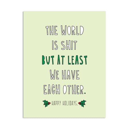 {"id":10241723007287,"title":"461 - The World is Shit (Happy Holidays)","handle":"461-the-world-is-shit-happy-holidays-a2-card","description":"A2 size (4.25\" x 5.5”)\nBlank Inside.\nPrinted on FSC certified 130# stock.\nPaired with a kraft envelope.\nPackaged in a clear open-top cello sleeve.\n\nDesign by Near Modern Disaster","published_at":"2025-10-22T11:24:49-05:00","created_at":"2025-07-24T22:13:01-05:00","vendor":"Near Modern Disaster","type":"","tags":["Holiday Card"],"price":600,"price_min":600,"price_max":600,"available":true,"price_varies":false,"compare_at_price":null,"compare_at_price_min":0,"compare_at_price_max":0,"compare_at_price_varies":false,"variants":[{"id":50875938996535,"title":"Default Title","option1":"Default Title","option2":null,"option3":null,"sku":"461","requires_shipping":true,"taxable":true,"featured_image":null,"available":true,"name":"461 - The World is Shit (Happy Holidays)","public_title":null,"options":["Default Title"],"price":600,"weight":14,"compare_at_price":null,"inventory_quantity":12,"inventory_management":"shopify","inventory_policy":"deny","barcode":null,"requires_selling_plan":false,"selling_plan_allocations":[]}],"images":["\/\/www.virtuforyou.com\/cdn\/shop\/files\/df7b18112d93b03bbcc0d985fa04cde5559ffb9e96ce88c30a228d0b9fb68198.jpg?v=1753413183","\/\/www.virtuforyou.com\/cdn\/shop\/files\/23443d0e5123afe8f10075a63739baa88be07b575d3d25f8e0971b2421c35721.jpg?v=1753413184","\/\/www.virtuforyou.com\/cdn\/shop\/files\/368465a517af1486e55ec8f19684bed9463e25ea917004163fac8182cd3cffa9_7a01f77b-e43c-4497-b4c4-5bec76e79444.jpg?v=1753413184"],"featured_image":"\/\/www.virtuforyou.com\/cdn\/shop\/files\/df7b18112d93b03bbcc0d985fa04cde5559ffb9e96ce88c30a228d0b9fb68198.jpg?v=1753413183","options":["Title"],"media":[{"alt":null,"id":41806943093047,"position":1,"preview_image":{"aspect_ratio":1.0,"height":2000,"width":2000,"src":"\/\/www.virtuforyou.com\/cdn\/shop\/files\/df7b18112d93b03bbcc0d985fa04cde5559ffb9e96ce88c30a228d0b9fb68198.jpg?v=1753413183"},"aspect_ratio":1.0,"height":2000,"media_type":"image","src":"\/\/www.virtuforyou.com\/cdn\/shop\/files\/df7b18112d93b03bbcc0d985fa04cde5559ffb9e96ce88c30a228d0b9fb68198.jpg?v=1753413183","width":2000},{"alt":null,"id":41806943125815,"position":2,"preview_image":{"aspect_ratio":1.0,"height":2000,"width":2000,"src":"\/\/www.virtuforyou.com\/cdn\/shop\/files\/23443d0e5123afe8f10075a63739baa88be07b575d3d25f8e0971b2421c35721.jpg?v=1753413184"},"aspect_ratio":1.0,"height":2000,"media_type":"image","src":"\/\/www.virtuforyou.com\/cdn\/shop\/files\/23443d0e5123afe8f10075a63739baa88be07b575d3d25f8e0971b2421c35721.jpg?v=1753413184","width":2000},{"alt":null,"id":41806943158583,"position":3,"preview_image":{"aspect_ratio":1.494,"height":500,"width":747,"src":"\/\/www.virtuforyou.com\/cdn\/shop\/files\/368465a517af1486e55ec8f19684bed9463e25ea917004163fac8182cd3cffa9_7a01f77b-e43c-4497-b4c4-5bec76e79444.jpg?v=1753413184"},"aspect_ratio":1.494,"height":500,"media_type":"image","src":"\/\/www.virtuforyou.com\/cdn\/shop\/files\/368465a517af1486e55ec8f19684bed9463e25ea917004163fac8182cd3cffa9_7a01f77b-e43c-4497-b4c4-5bec76e79444.jpg?v=1753413184","width":747}],"requires_selling_plan":false,"selling_plan_groups":[],"content":"A2 size (4.25\" x 5.5”)\nBlank Inside.\nPrinted on FSC certified 130# stock.\nPaired with a kraft envelope.\nPackaged in a clear open-top cello sleeve.\n\nDesign by Near Modern Disaster"}