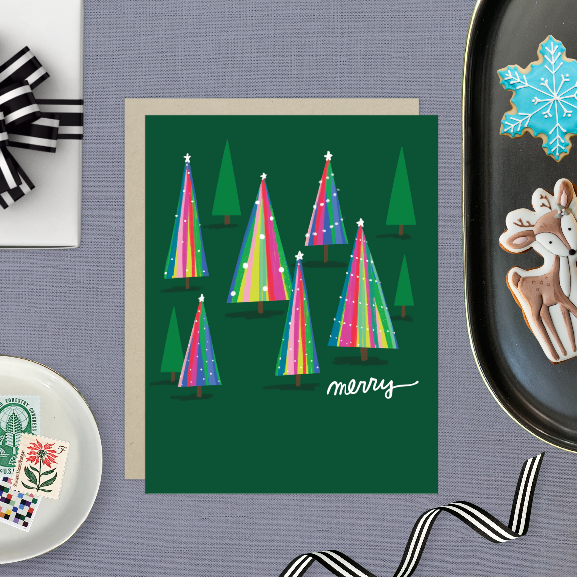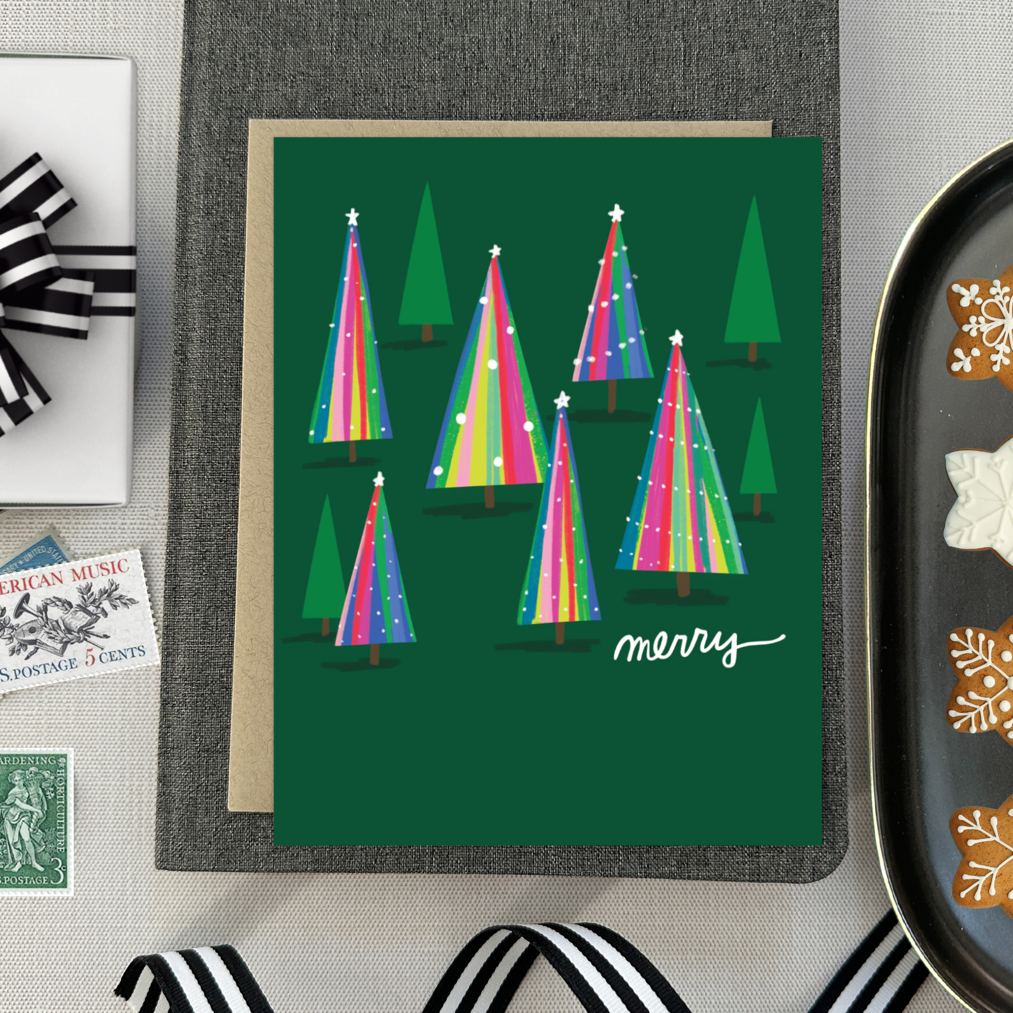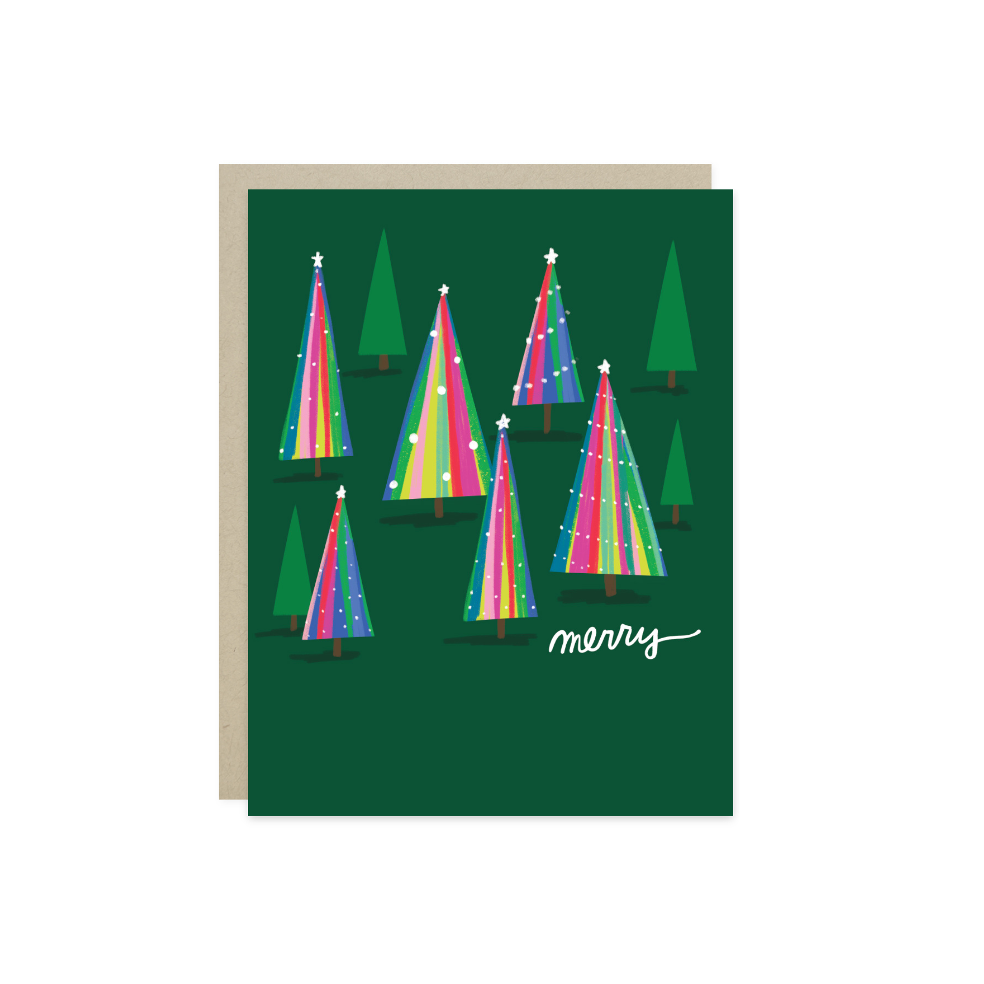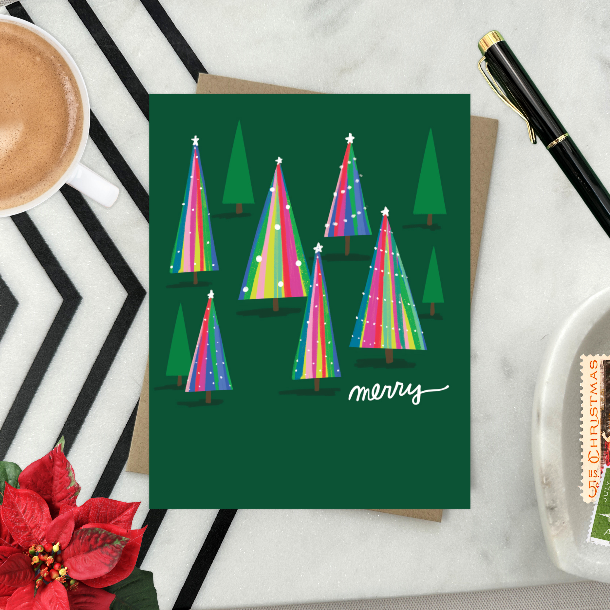 These festive greetings feature whimsical Christmas trees in vibrant hues that pop against the season's traditional palette. Perfect for sending cheerful wishes to friends and family who appreciate a playful twist on classic holiday designs. • FSC Certified cover paper • 5.5" W × 4.25" L (A2 size) • Single card paired with kraft envelope • Blank inside for your sentiment • Made in USA