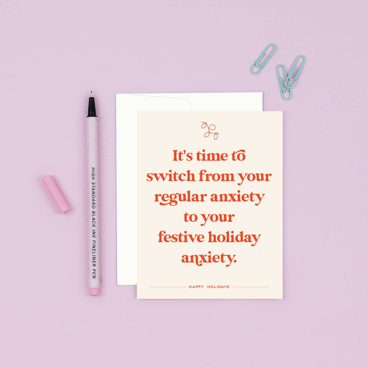 A holiday card to celebrate the festive feeling that accompanies the season: anxiety! • A2 greeting card (4.75" x 5.5" • printed on fine 100# stock • made in the USA • cream envelope • comes packaged in a cello sleeve " Reads "It's time to switch from your regular anxiety to your festive holiday anxiety. / Happy Holidays"