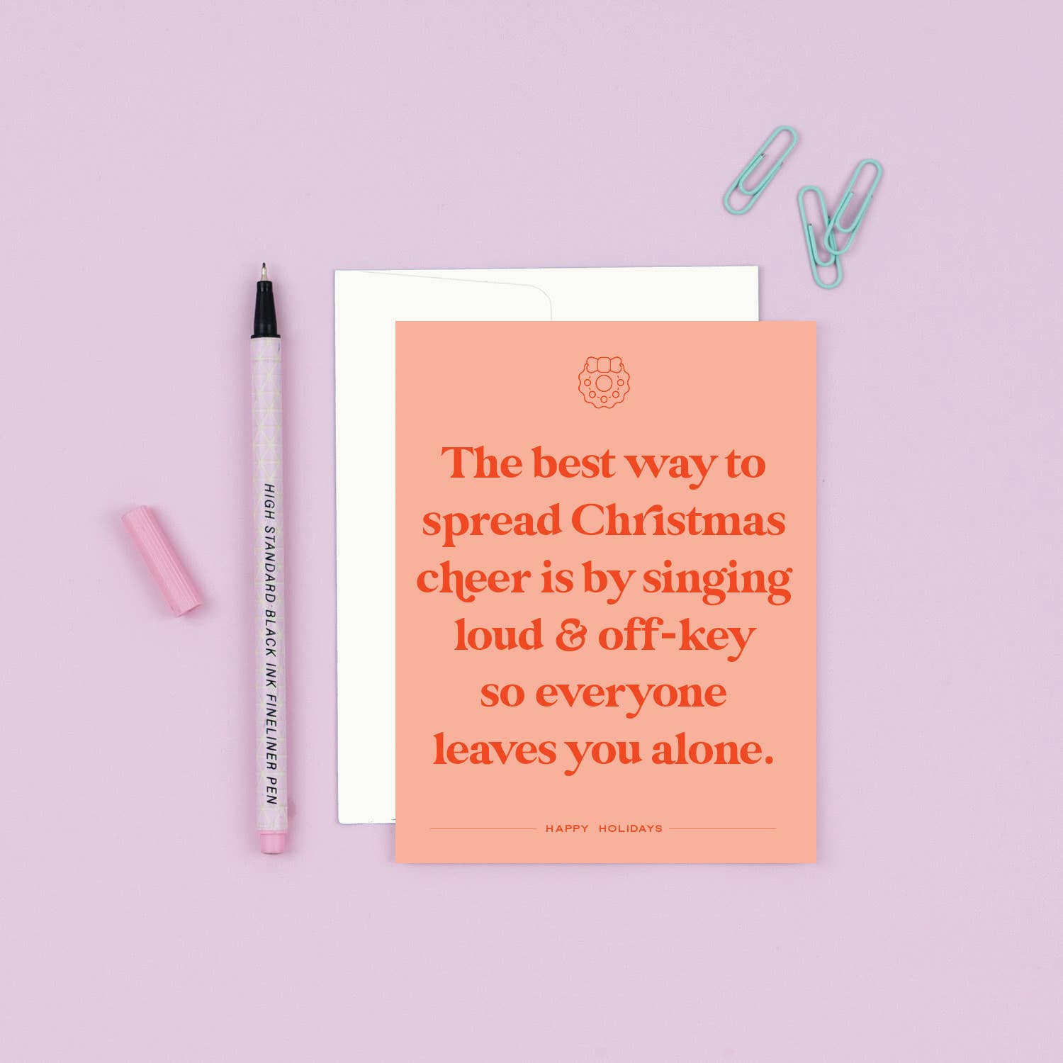 Like Buddy the Elf, but snarky and antisocial: the funny holiday card for your favorite Scrooge. Bah humbug! • A2 greeting card (4.75" x 5.5" • printed on fine 100# stock • made in the USA • cream envelope • comes packaged in a cello sleeve " Reads "The best way to spread Christmas cheer is by singing loud and off-key so everyone leaves you alone. / Happy Holidays"