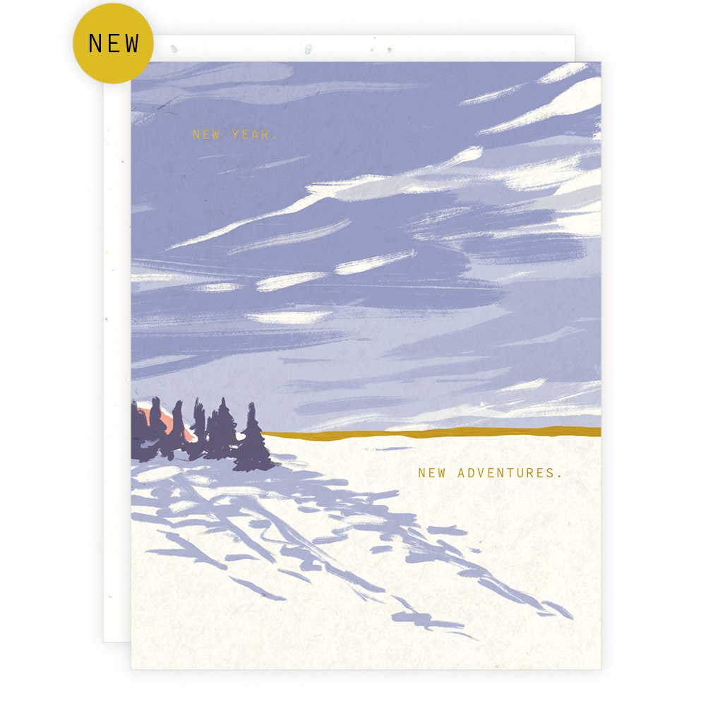 New Year. New Adventures. DETAILS: Blank inside Foil details Size: A2 folded 4.25” x 5.5” Envelope: open end with multi-color flecks