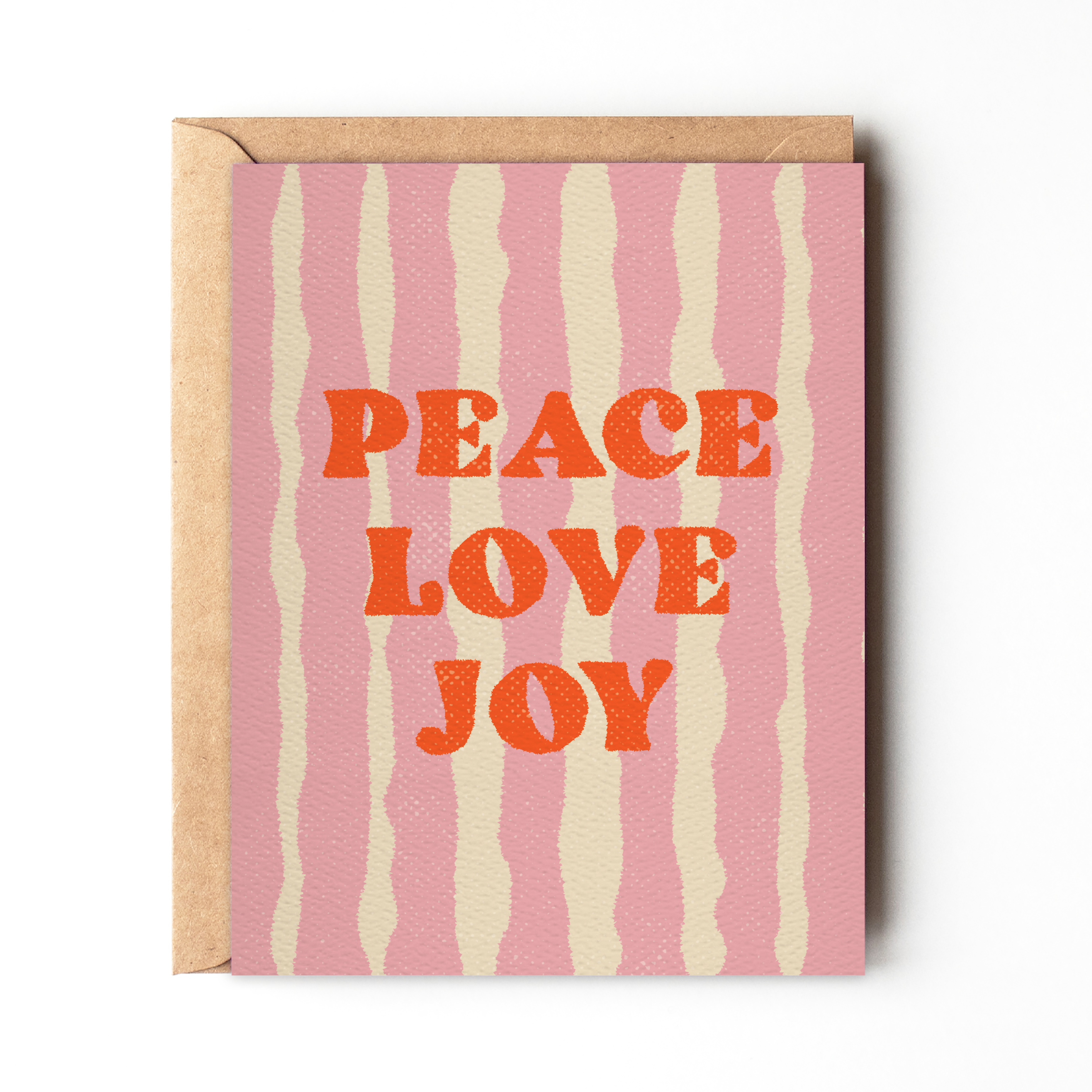 Peace Love Joy, a pink and red stripe Holiday card on our signature textured card stock. Our greeting cards are: • A2 size card (4.25" x 5.5") • Blank inside • High-quality digital print on thick, premium textured cardstock • 100% recycled envelope • Packed in an eco-friendly biodegradable clear sleeve • Made locally in Portland, Oregon, USA Our cards have a signature retro, beach vibe. We are known for our use of color and will surely bring a pop of brightness and fun to your shelves. We stand proudly behind the quality of our cards - it is often the first thing retailers comment on. Our card assortment covers many occasions. The collection includes: • Birthday cards: funny cards for your best babes • Love cards: cards for weddings, anniversaries and valentines day • Everyday cards: just because cards, and friendship cards to keep on hand • Thank you cards: appreciation cards to show thanks • Holiday cards: Christmas and Thanksgiving This is a fun, modern Christmas card.