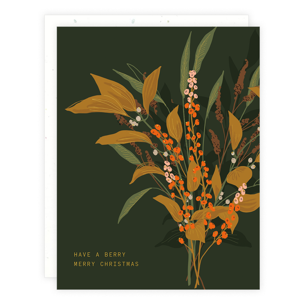 Have a berry Merry Christmas. DETAILS: Blank inside Foil details Size: A2 folded 4.25” x 5.5” Envelope: open end with multi-color flecks