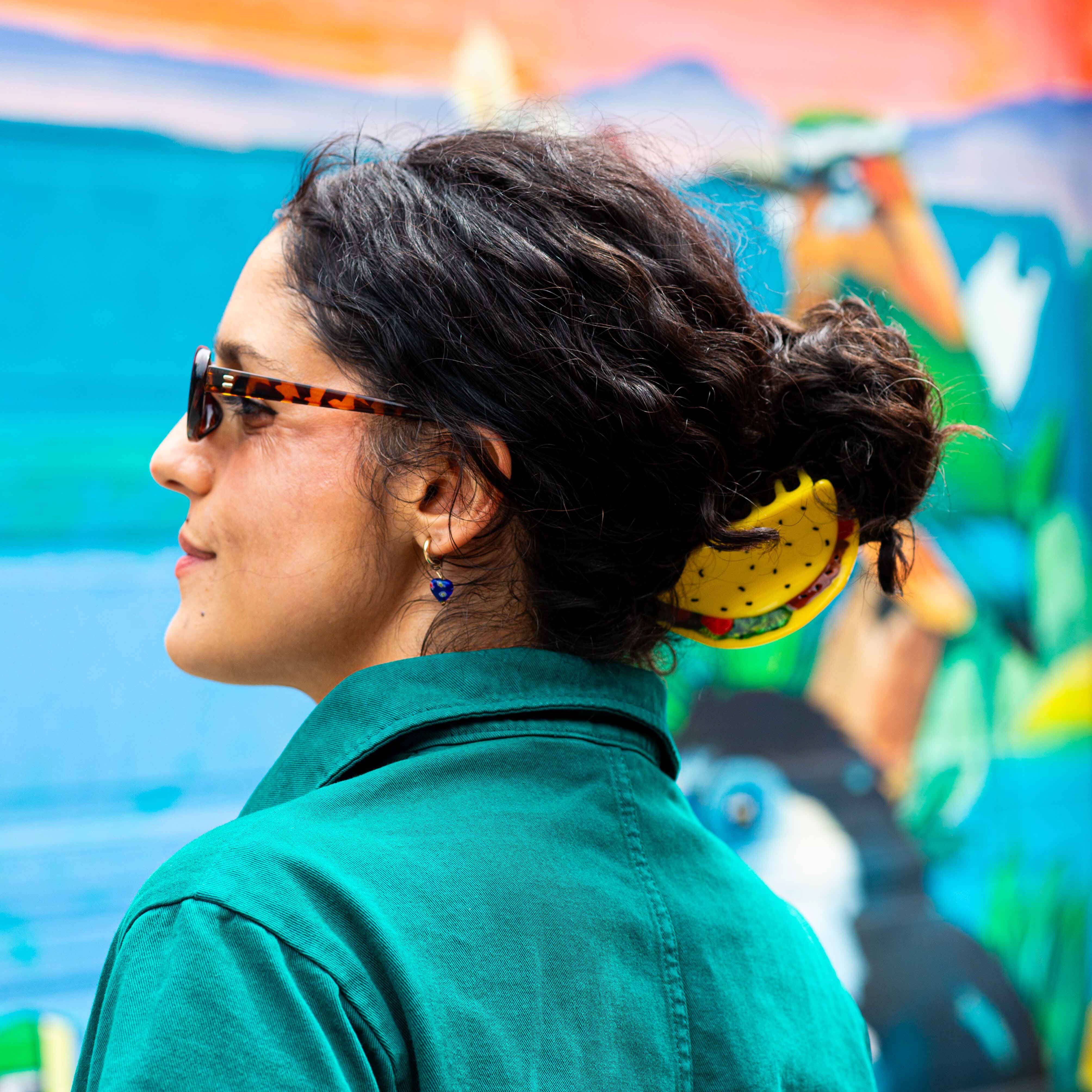 Spice up your look with our Taco Hair Claw! Made from planet-friendly cellulose acetate, this tasty accessory is part of our fun collab with Dreasdoodles. Measuring 4" x 2", each claw has its own unique color variations—just like your favorite taco toppings! Designed in San Francisco and ethically produced, it’s the perfect eco-conscious way to add flavor to your style. ¡Que rico! This hair claw is part of the Mercado Collection, celebrating the vibrant sabores de México! From spicy chiles and sweet tres leches cake to a classic taco, fiery hot sauce, and a refreshing paleta, each piece captures the essence of Mexican cuisine and culture. Created in collaboration with Mexican American artist Andrea Campos, the creative force behind @dreasdoodles, this collection pays tribute to the central role that food plays in Mexican culture—bringing people together and telling stories through flavor. ¡Buen provecho!