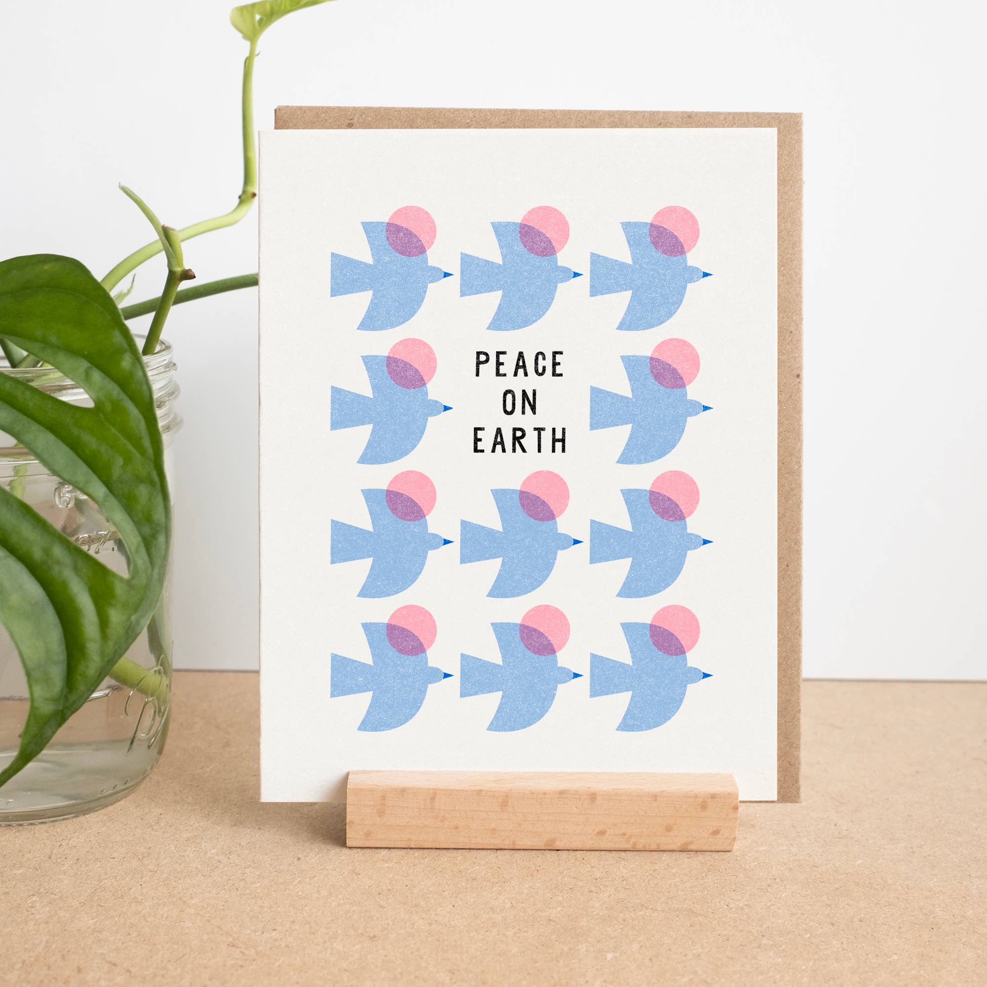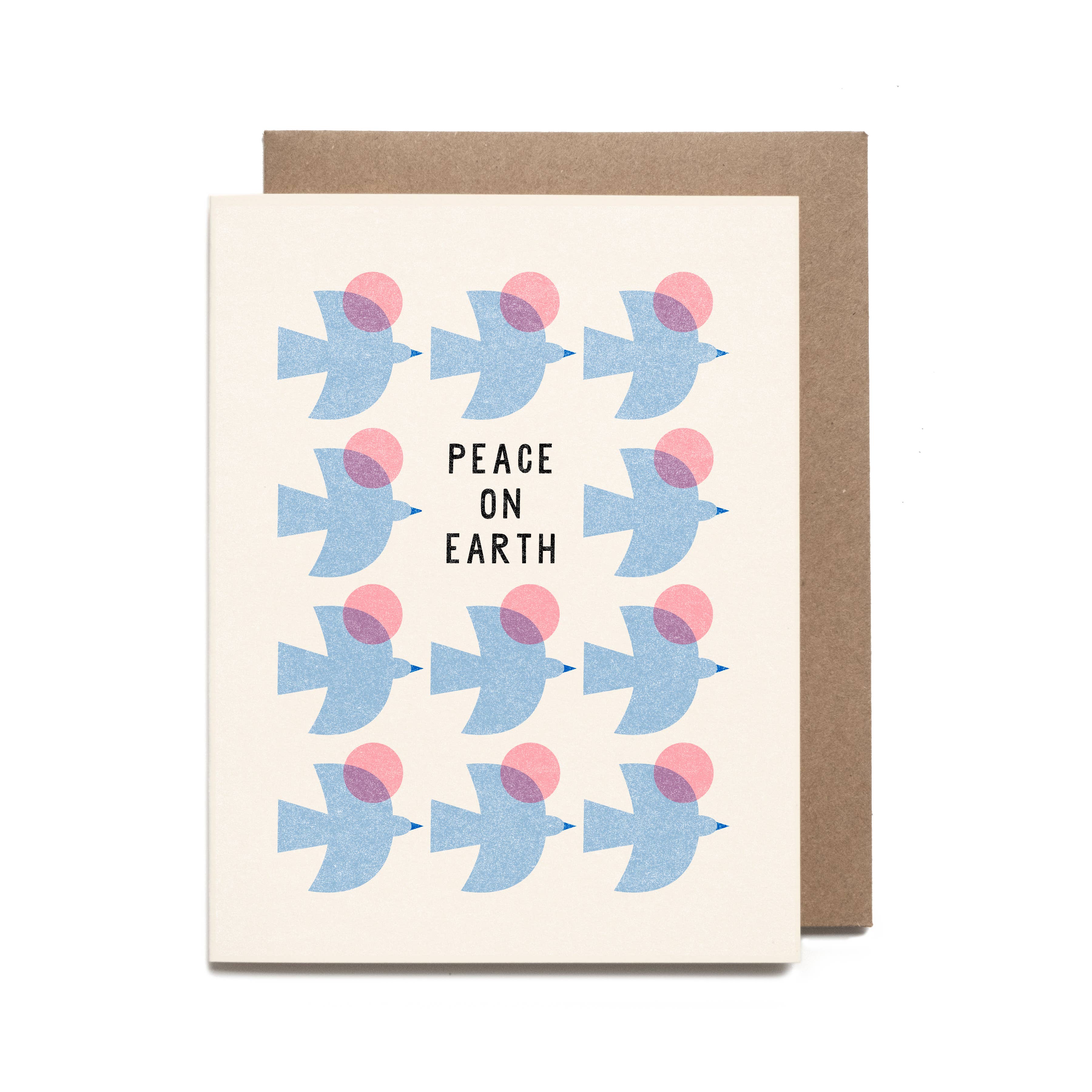 A hopeful message for the holiday season, brought to life in vibrant Risograph layers. This holiday card features a grid of blue birds, symbols of hope and harmony, arranged in a calming, rhythmic pattern. Printed in cool tones with soy-based inks on recycled paper, it quietly says Peace on Earth with love and grace. A modern, heartfelt way to share season's greetings and joy. We riso print our greeting cards sustainably and locally! Riso printed with plant inks on recycled paper. Size: Folded A2 Single Card with one kraft envelope Blank Inside • Handmade • Faire Insider Free Shipping • Eco-friendly • Plastic-free packaging option available on request