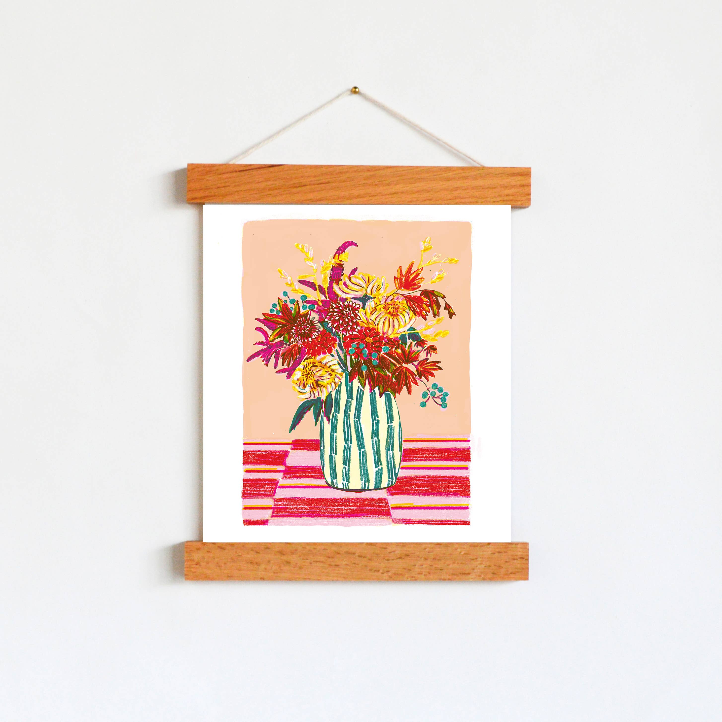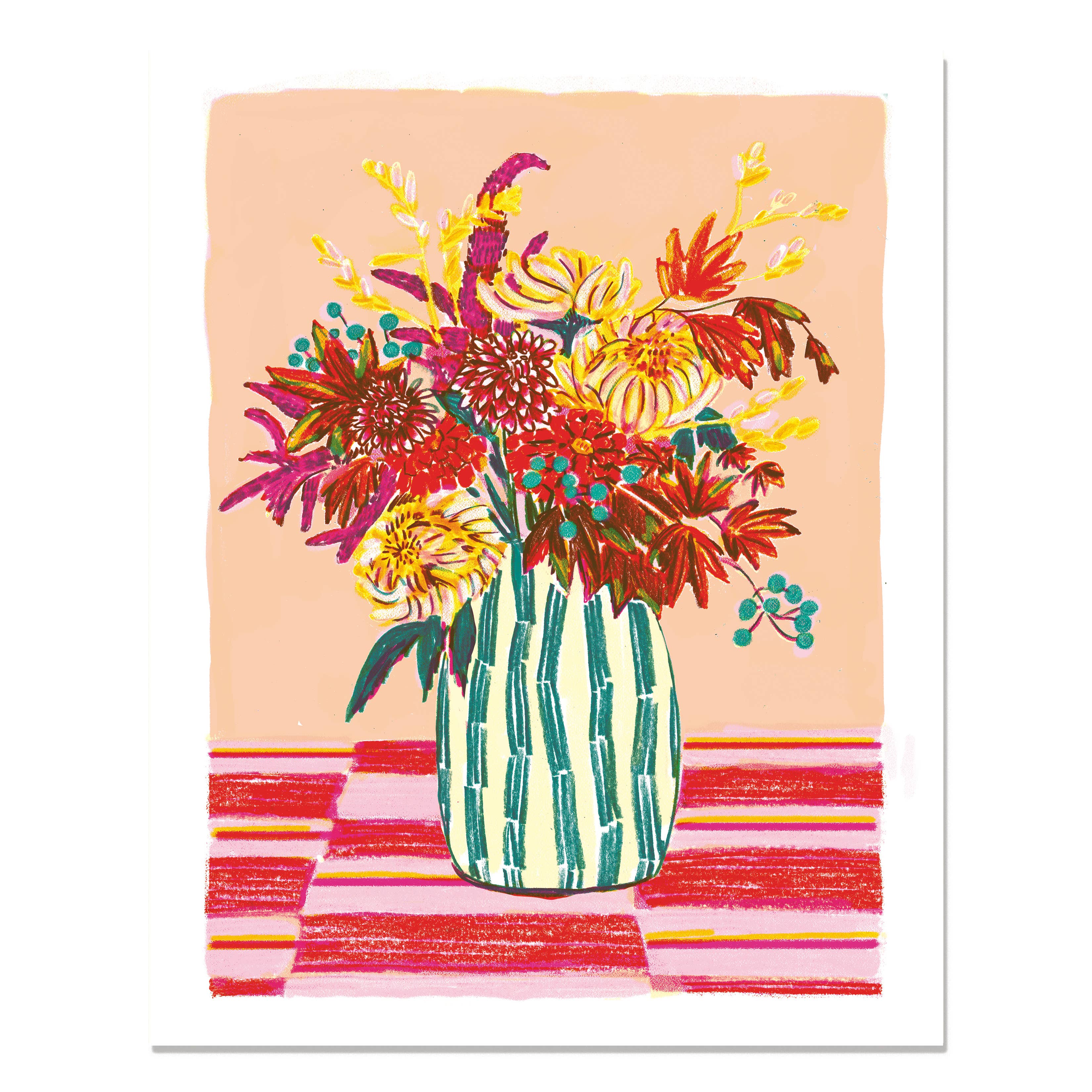 This lush still life was first rendered in colored pencil, then transformed into a richly layered risograph print. Autumnal chrysanthemums and dramatic foliage fill a striped vase, set atop a red and pink woven surface. Printed with soy-based risograph inks on recycled paper. Art Print measures 8"x10" Printed in the USA. Please note riso is a spot color process that makes every print unique, and slight imperfections are part of its charm. Mild variation in ink coverage and registration and minimal smudging might make some of your prints look different from one another.