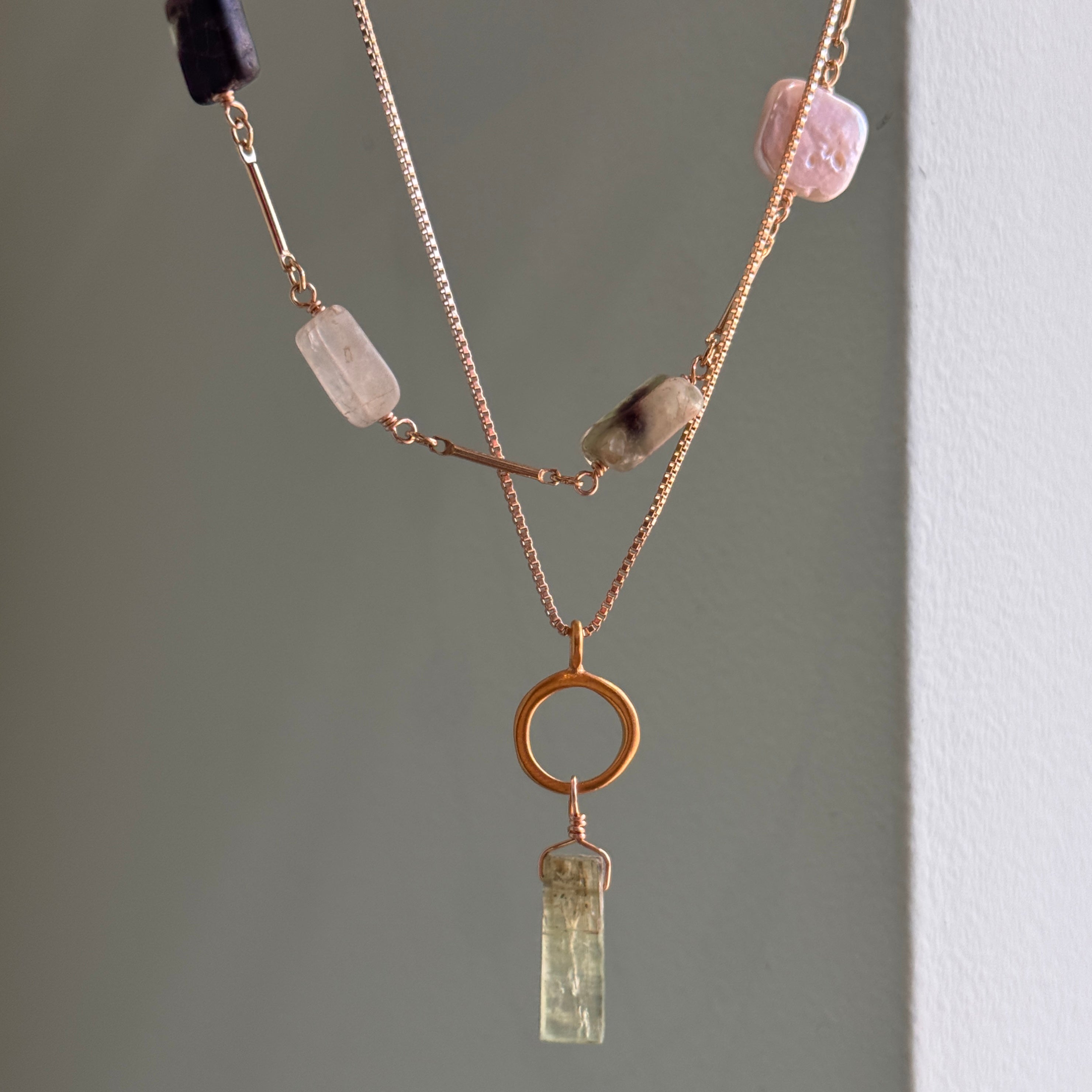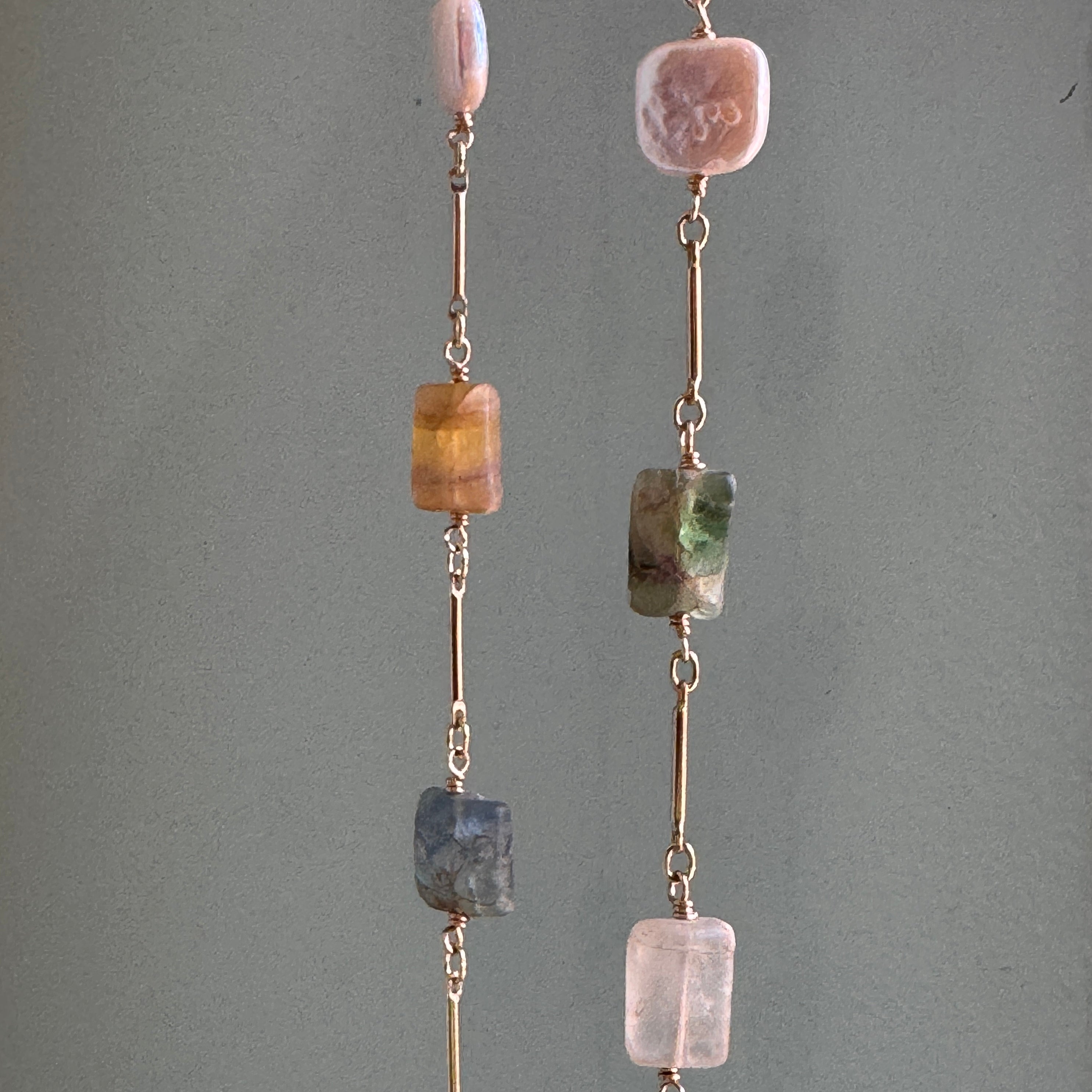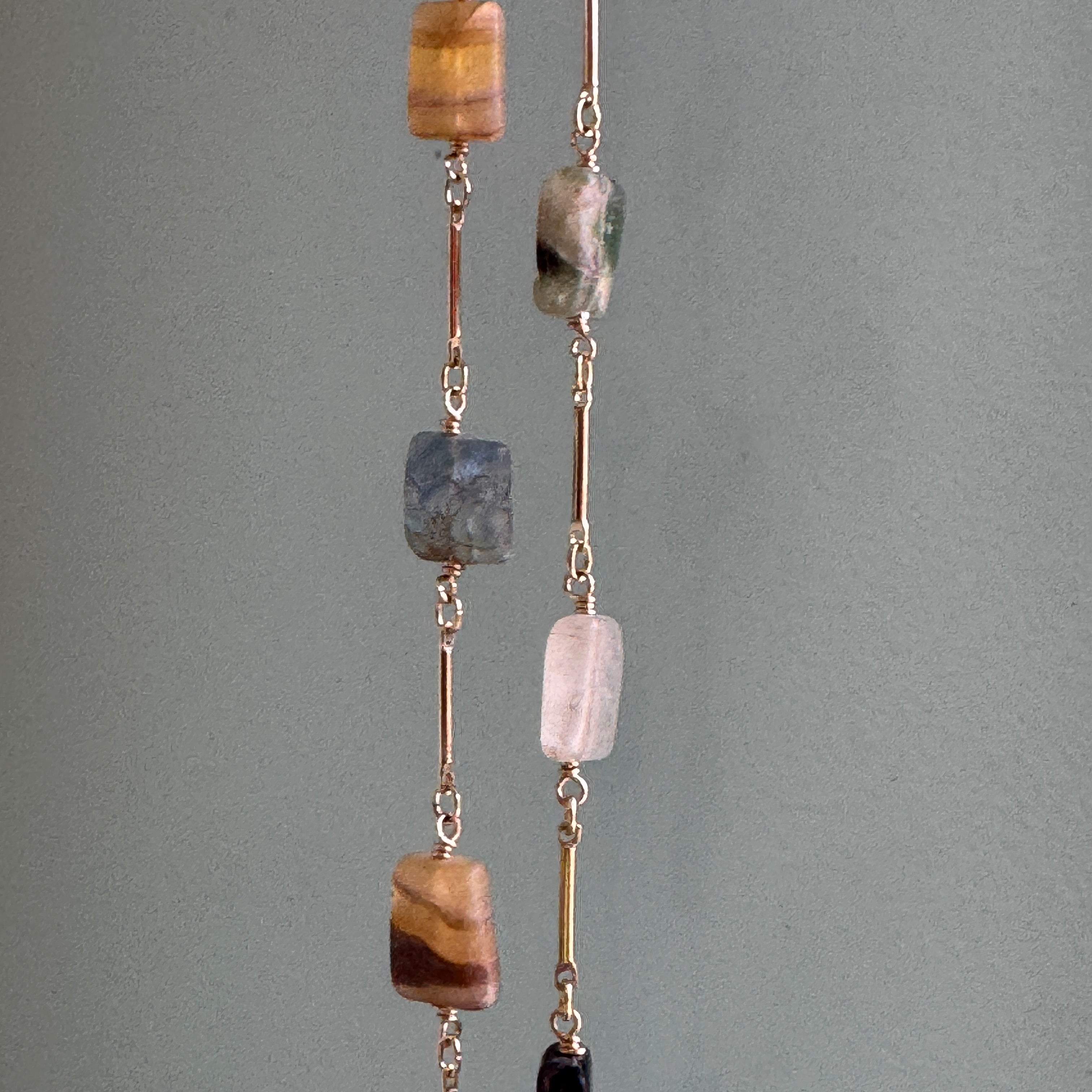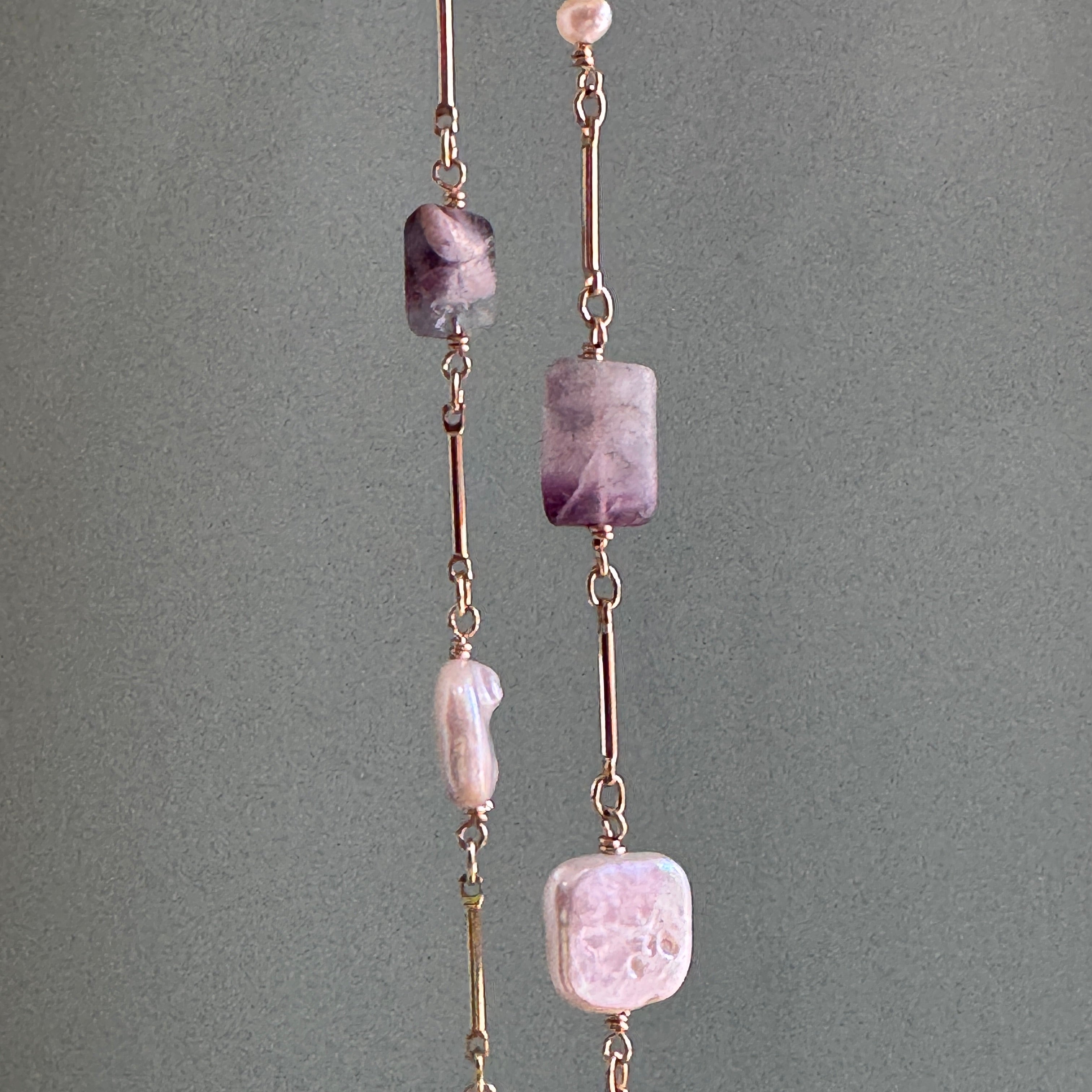 Fluorite & pearl chain necklace in silver or vermeil. Necklace measures 17" long Item# 188-11sn/vn. Our vermeil is sterling silver dipped in 16k gold. Findings are sterling silver and 14k gold fill. Handmade in Oakland, CA. • fluorite, and pearl • sterling silver or gold fill • 17” bar chain • Handmade in Oakland, CA