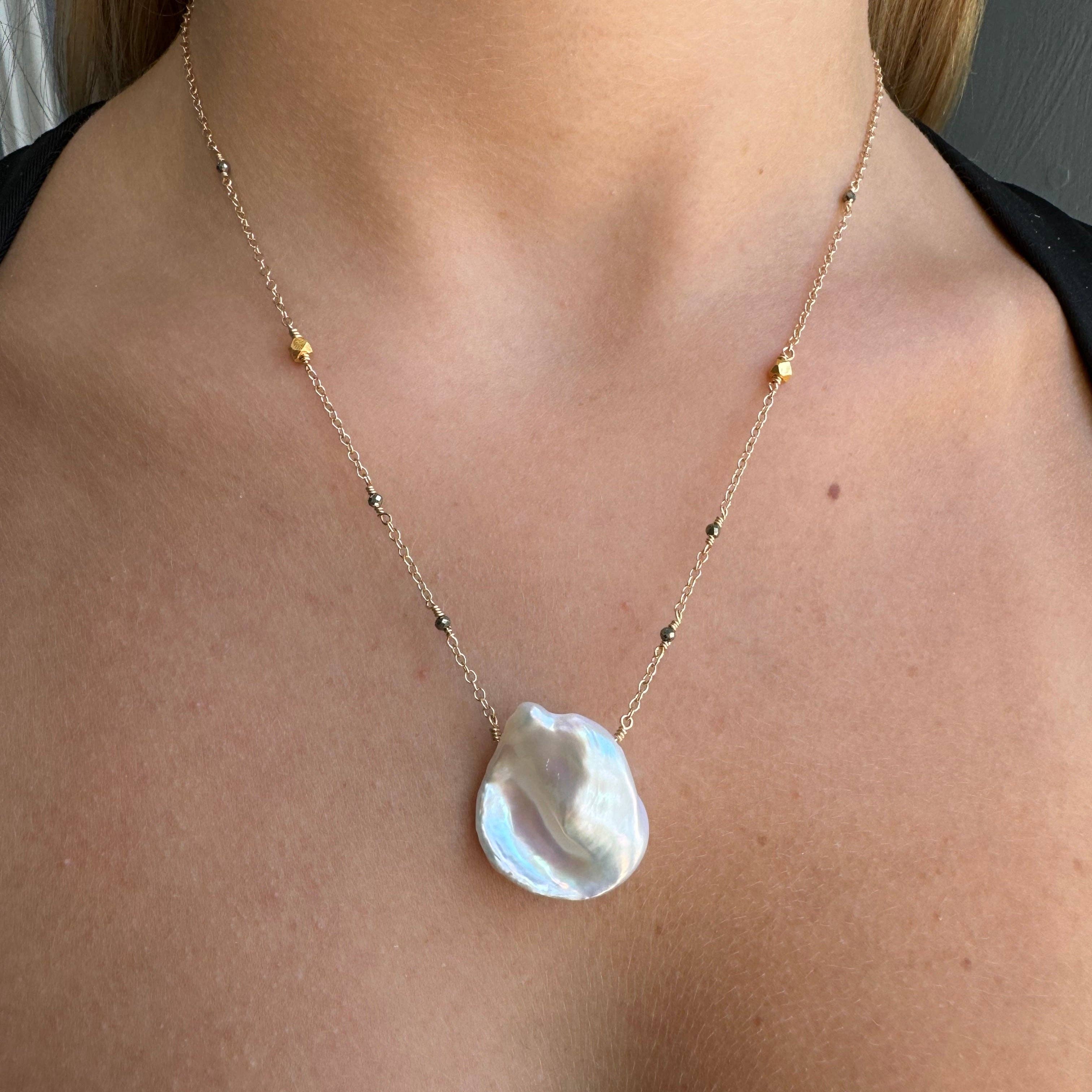 large pearl in silver or vermeil. Pendant hangs approx. 1" long on a 16” chain with pyrite beads with 2" extender. Item# 190-21 sn/vn. Our vermeil is sterling silver dipped in 16k gold. Findings are sterling silver and 14k gold fill. Handmade in Oakland, CA. * pearl and pyrite * sterling silver, vermeil & gold fill * 16” chain w. 2” extender * 1” long pendant * made in Oakland, CA