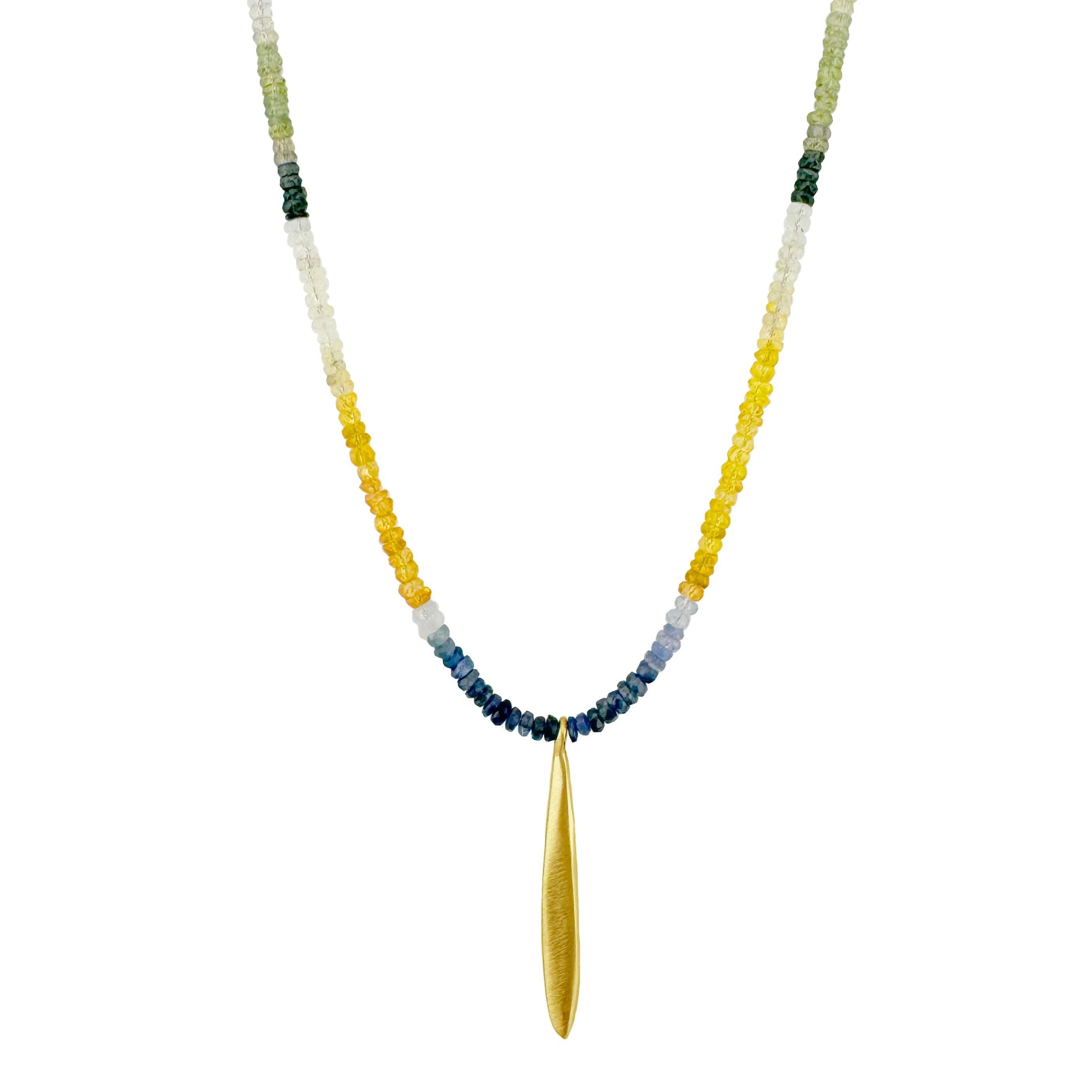 long drop on multi sapphire in silver, vermeil, or mixed. Pendant hangs approx. 1 1/2" long on a 16” chain with 2" extender. Item# 189-11 sn/vn. Our vermeil is sterling silver dipped in 16k gold. Findings are sterling silver and 14k gold fill. Handmade in Oakland, CA. * multi sapphire * sterling silver, vermeil & gold fill * 16” beaded chain w. 2” extender * 1 1/2” long pendant * made in Oakland, CA