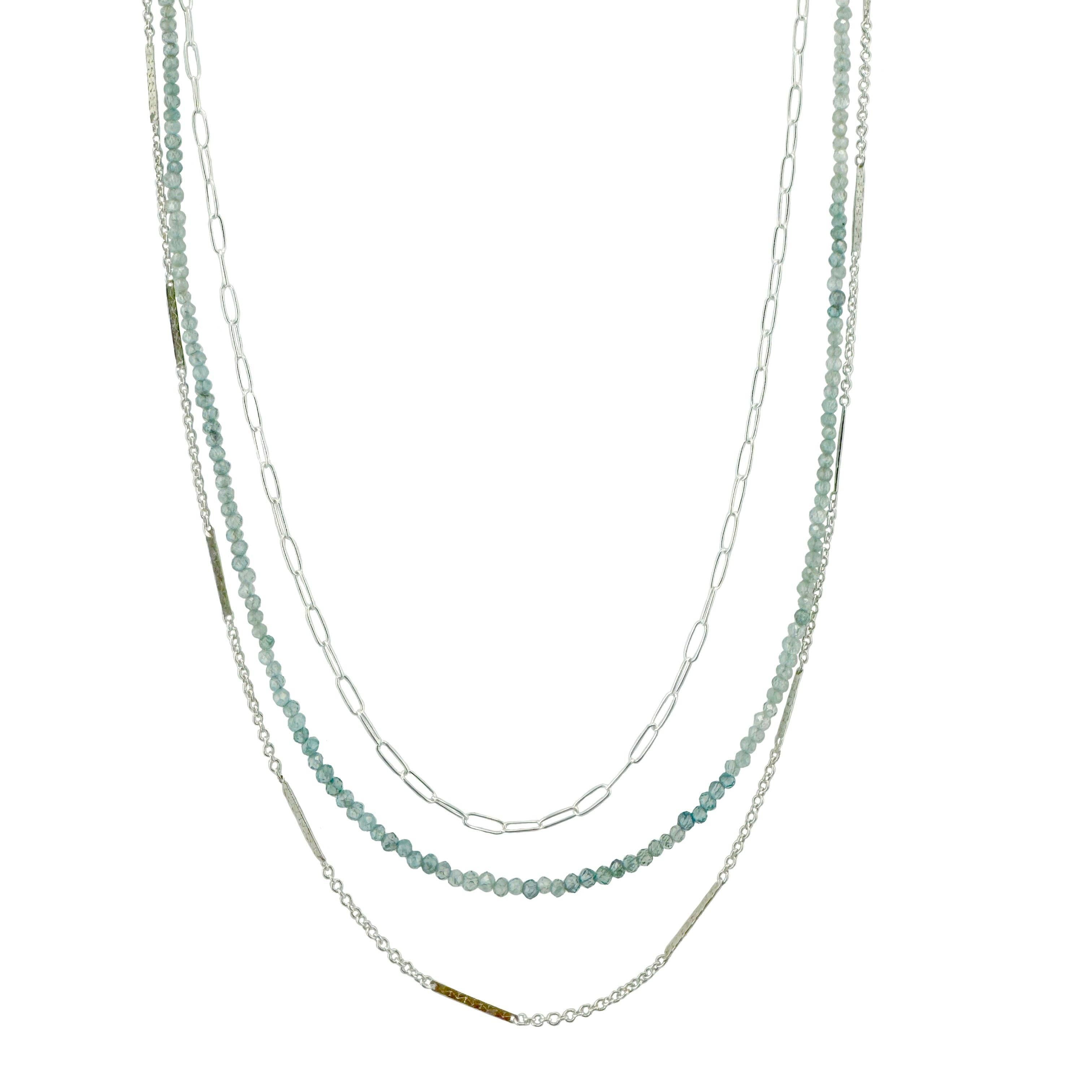 Triple strand chain & zircon silver or gold fill necklace. Chains measure 16", 18", and 20". Item# 187-09sn/vn Our vermeil is sterling silver dipped in 16k gold. Findings are sterling silver and 14k gold fill. Handmade in Oakland, CA • 16” and 20” chains • vermeil, gold fill, silver • 18” blue zircon strand • handmade in Oakland, CA