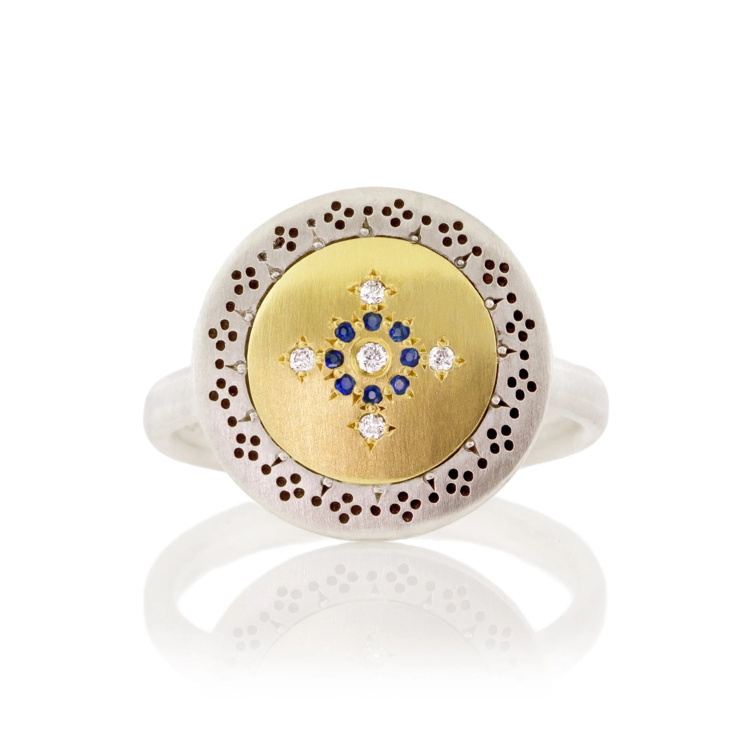 - 13 hand set brilliant sapphires + diamonds, .04 ct