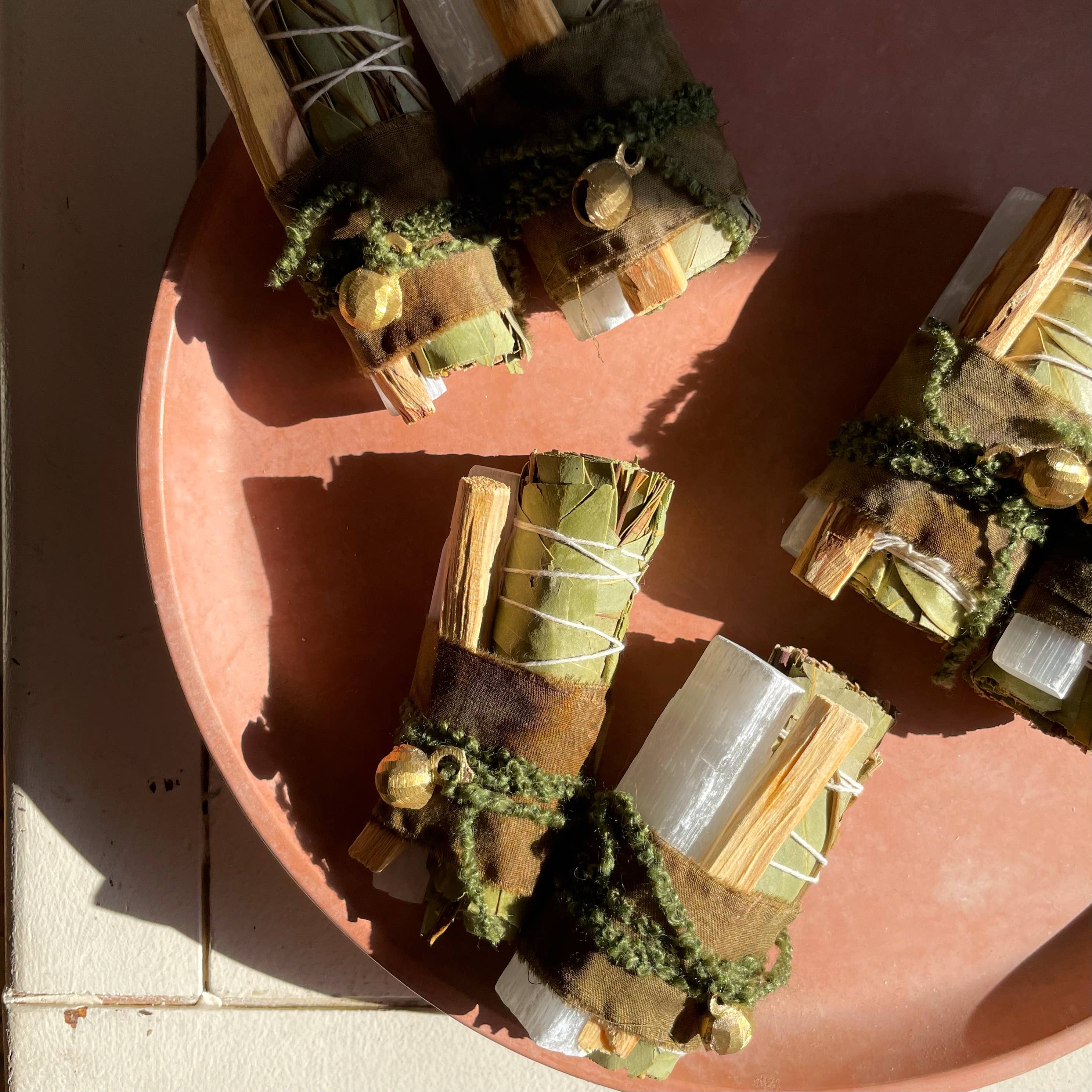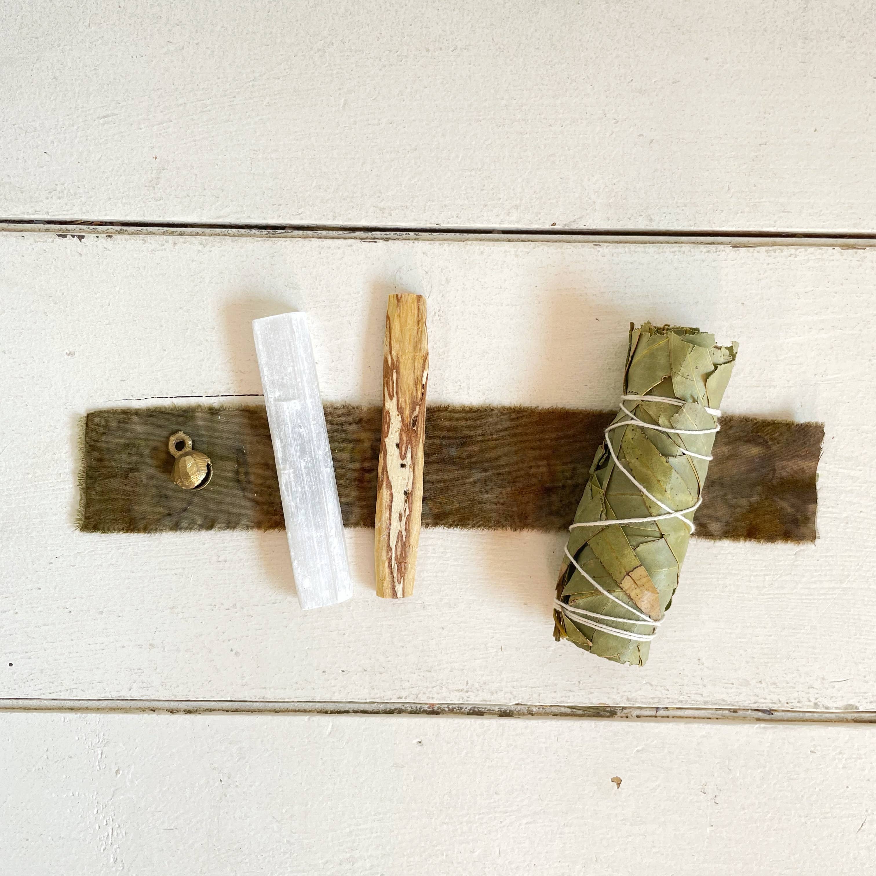 a selenite wand and one palo santo stick bundled in vintage fabric and string, with a brass bell. each piece is one of a kind. eucalyptus bundle is about three inches. size and color varies. Every Catherine Rising piece is assembled with care, by hand, by our close-knit team in our Rochester, NY studio. While we do our best to keep stock of each product on hand and ship out orders as quickly as possible, we ask that you please allow two to three weeks for turnaround time. All of the string, fabric, and ribbon that we use for our products is purchased from a local non-profit which/that sells vintage and deadstock sewing and crafting materials. Proceeds go back to the community, providing sewing and textile-based classes, as well as job training.