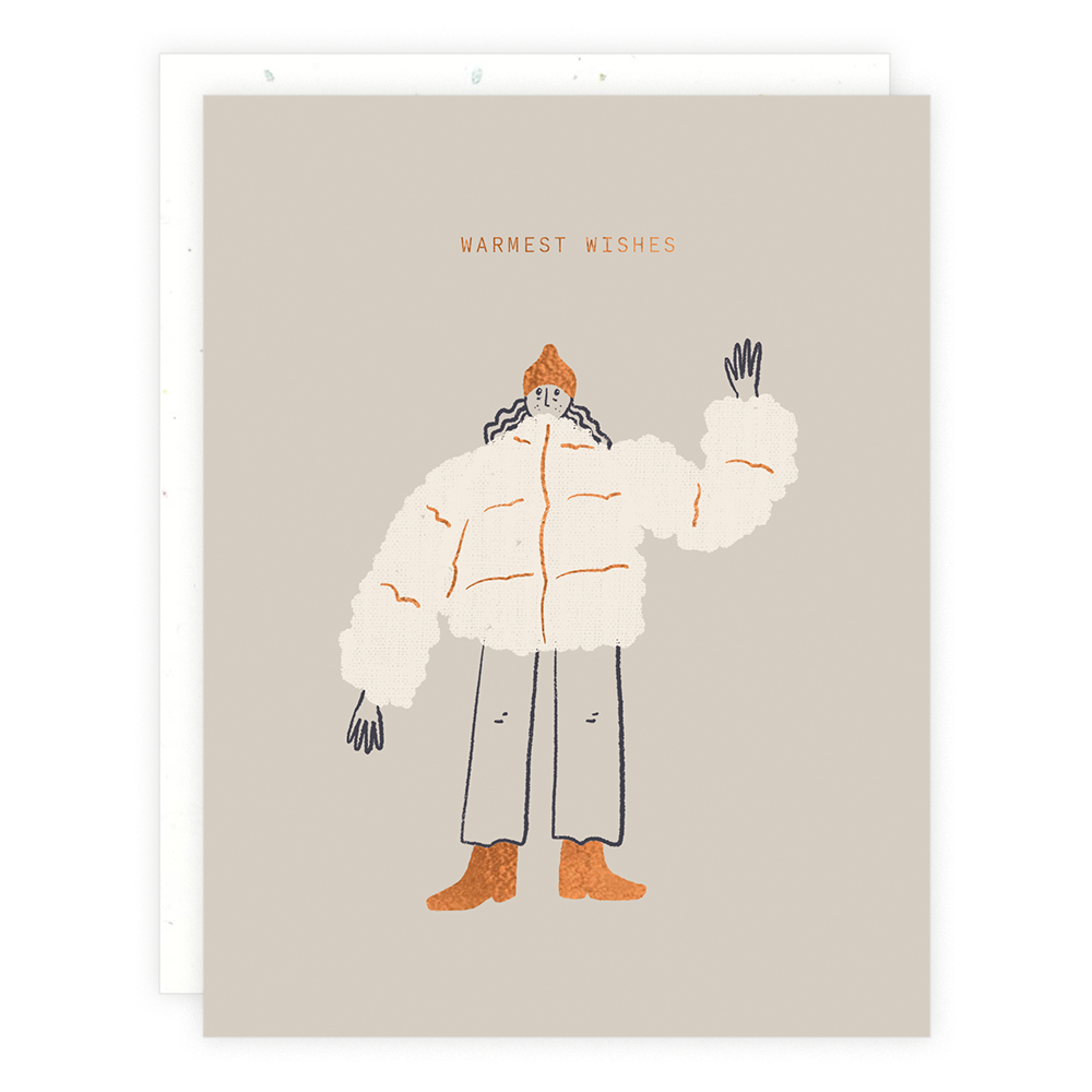 Warmest Wishes DETAILS: Blank inside Foil details Size: A2 folded 4.25” x 5.5” Envelope: open end with multi-color flecks