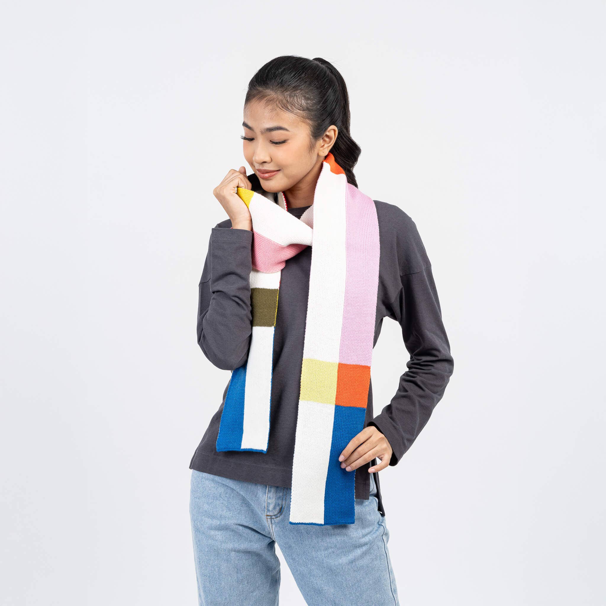 A vintage-inspired long skinny scarf knitted with bold colorblocking. Colorful, reversible, and unisex. For indoor and outdoor wear. Can be tied and wrapped in many different ways depending on weather or mood. Knit with new and repurposed deadstock yarn. Details: 100% Soft Acrylic Machine wash cold gentle cycle, dry flat 5"W x 84"L