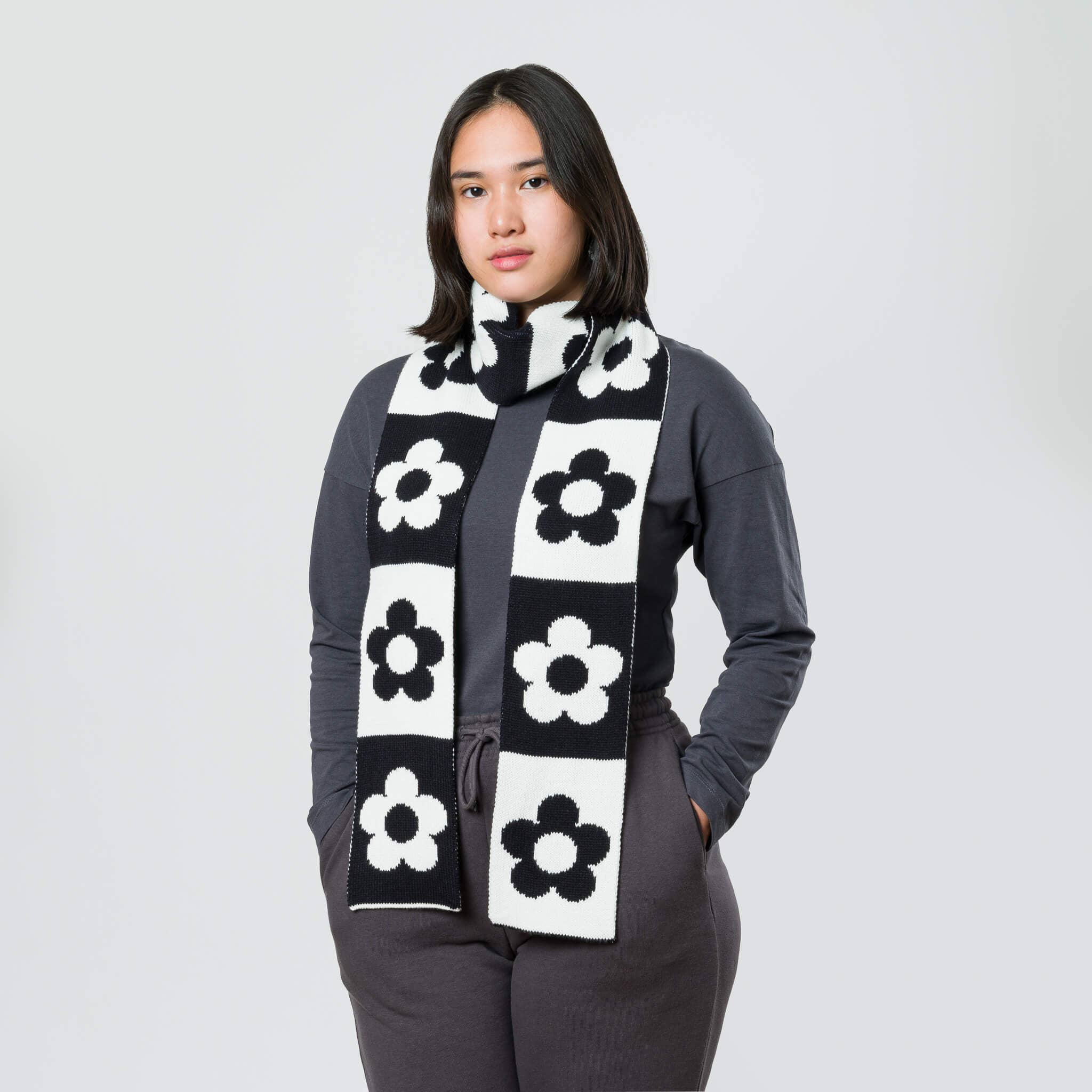 A vintage-inspired long skinny scarf knitted with contrasting flower blocks. Colorful, reversible, and unisex. For indoor and outdoor wear. Can be tied and wrapped in many different ways depending on weather or mood. Knit with repurposed deadstock yarn. Details 100% Soft Acrylic Machine wash cold gentle cycle, dry flat 84”L x 5”W