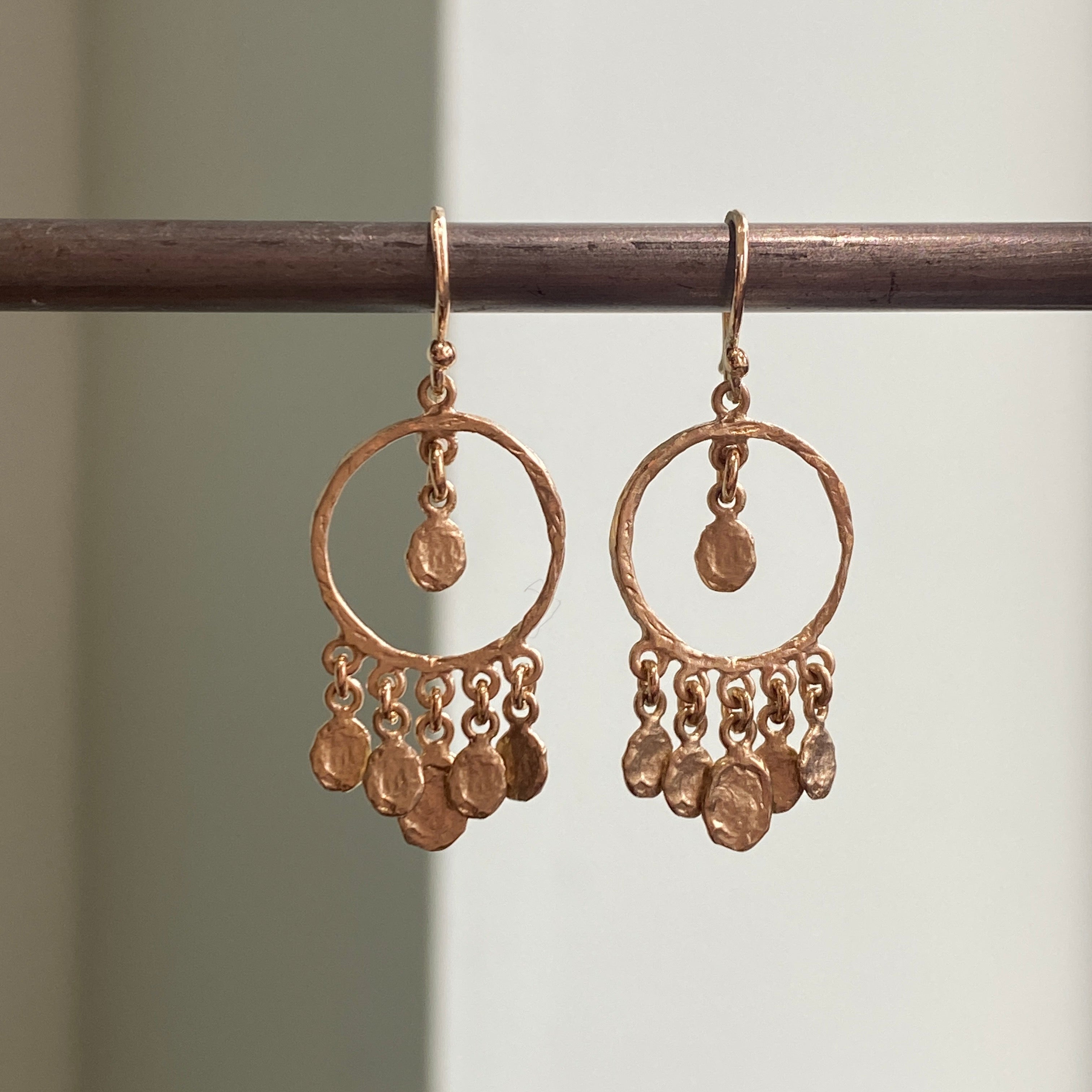 Crafted in 14kt yellow gold, the textured hoops features a single dangling disk within an open circle. A spangle of fringe allows for a golden dance with every move you make.