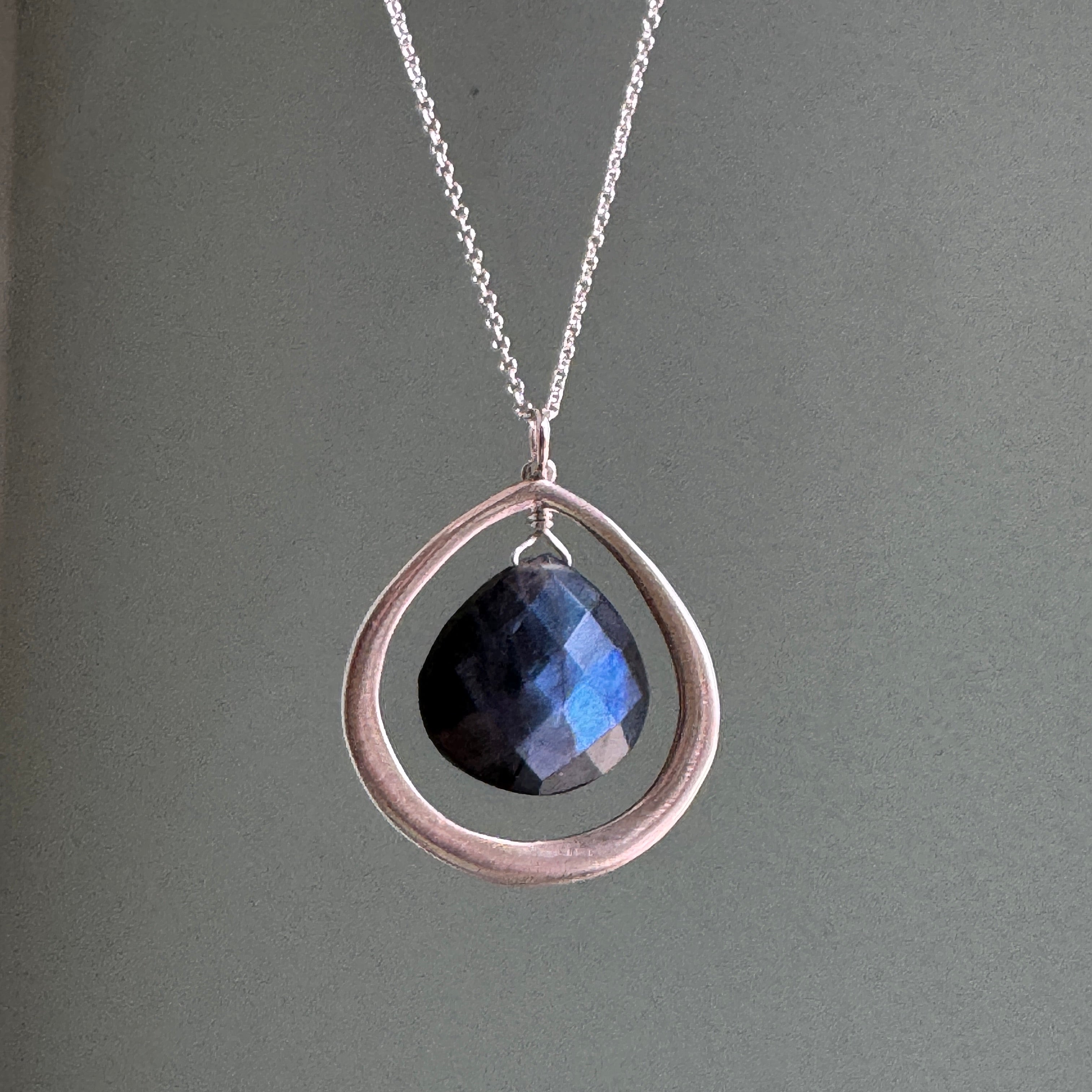 Large labradorite & drop in silver or vermeil necklace. Pendant hangs approx. 1 1/4" long on a 16" cable chain with 2" extender. Item# 180-47sn/vn. Our vermeil is sterling silver dipped in 16k gold. Findings are sterling silver and 14k gold fill. Handmade in Oakland, CA. • pendant hangs 1 1/4” • labradorite • 16” thick cable chain w/ 2” extender • sterling silver, vermeil, and gold fill • handmade in Oakland, CA