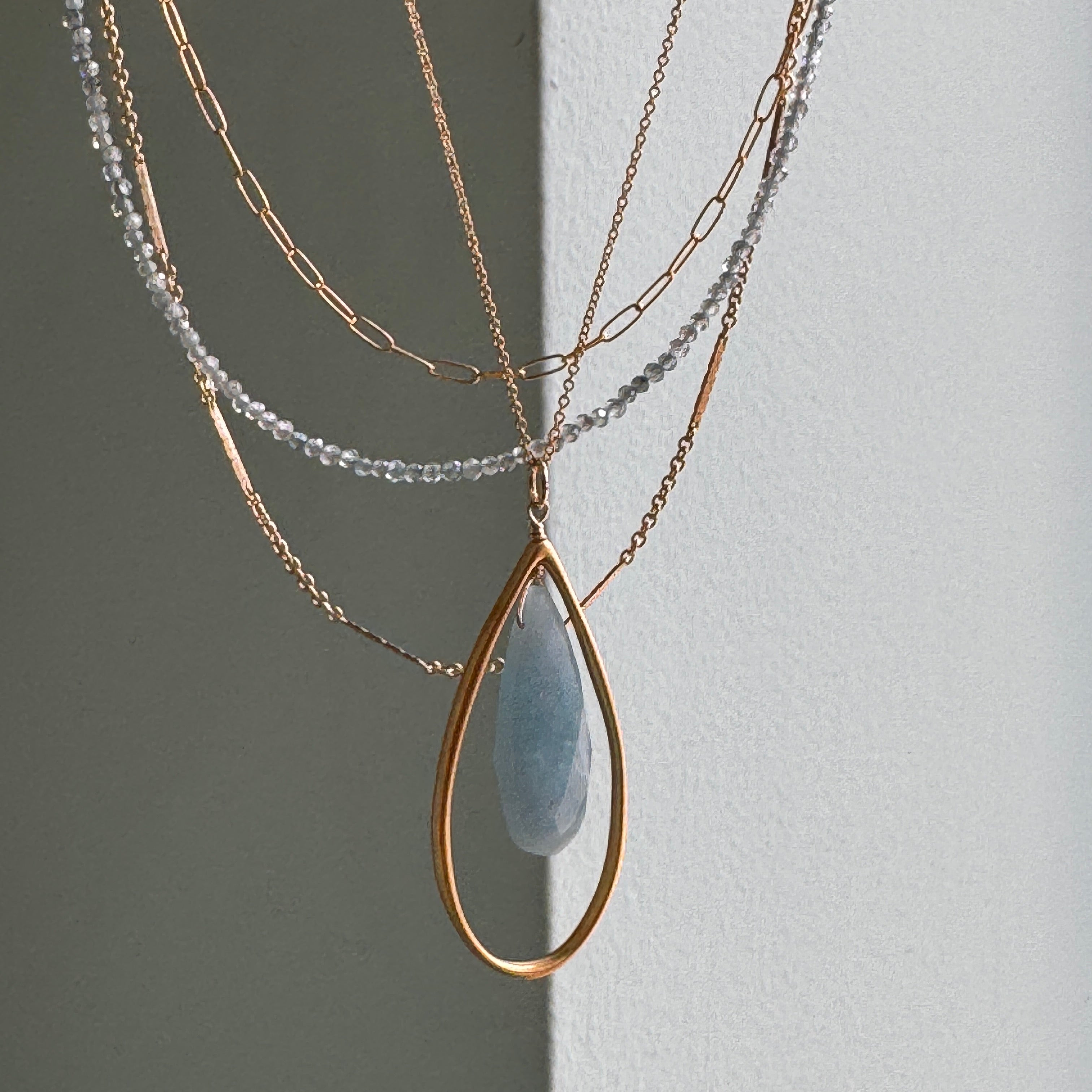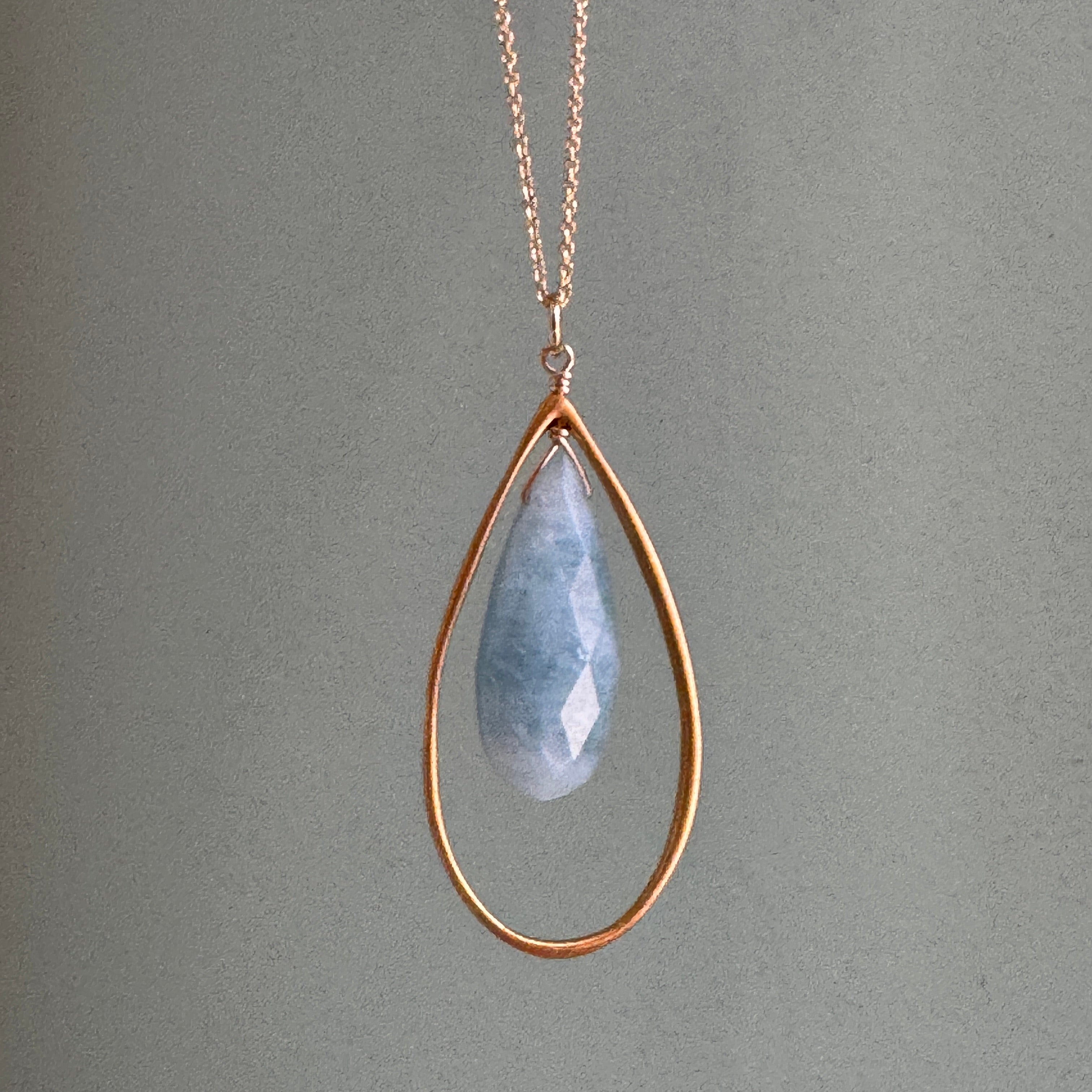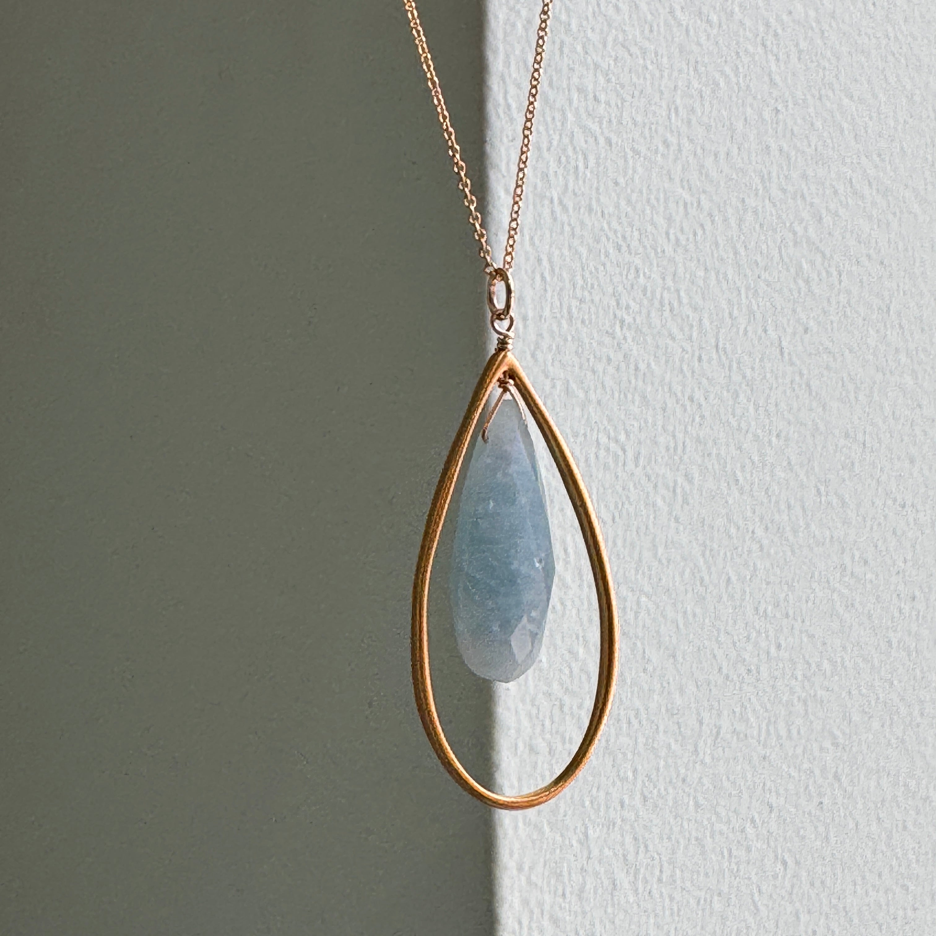 Large open teardrop w. aquamarine silver or vermeil necklace. Pendant hangs approx. 2" long on a 16" cable chain with a 2" extender. Item# 187-07sn/vn Our vermeil is sterling silver dipped in 16k gold. Findings are sterling silver and 14k gold fill. Handmade in Oakland, CA • hangs 2” • 16” cable chain • 2” extender • vermeil, gold fill, silver • aquamarine • handmade in Oakland, CA