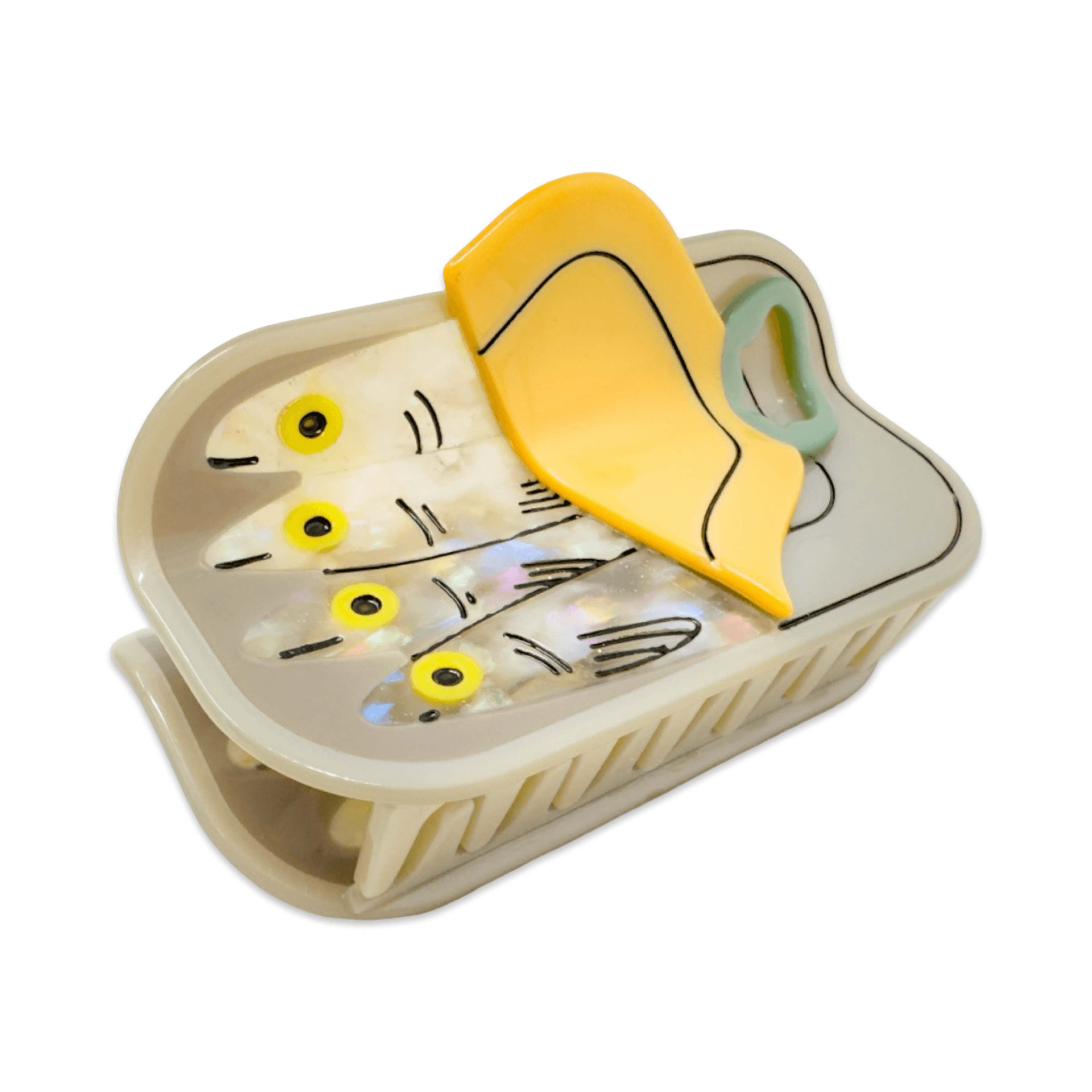 Reel in some fun with our Large Tinned Fish Hair Claw Clip! Measuring about 4" x 2", this playful claw features four little sardines tucked inside a tin. Handmade and hand-painted from eco-friendly cellulose acetate, each piece has unique details. Perfect for seafood lovers, quirky accessory fans, or anyone who wants a sustainable, statement-making hair clip.