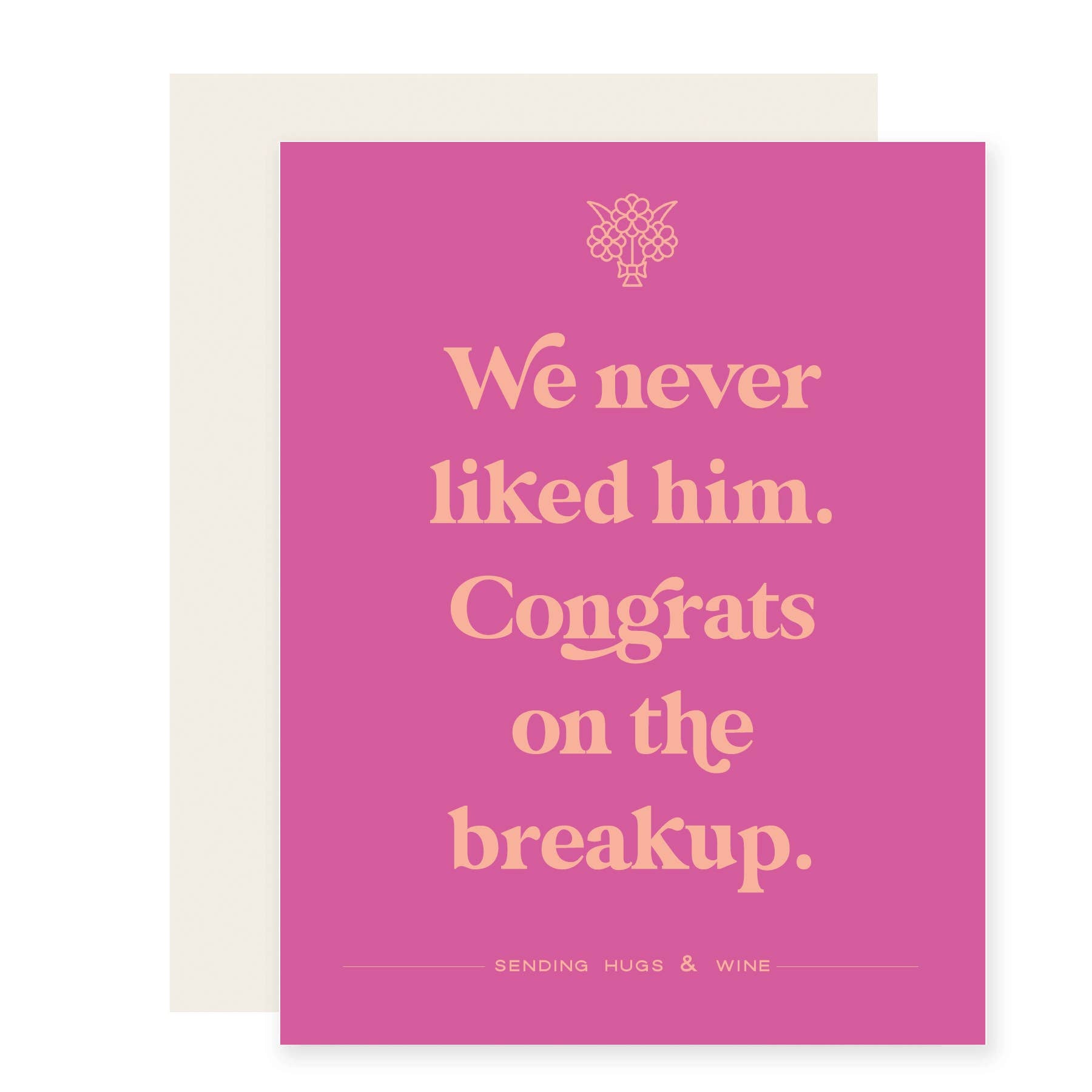 Because some breakups deserve a celebration! • A2 greeting card (4.75" x 5.5") • printed on fine 100# stock • made in the USA • cream envelope • comes packaged in a cello sleeve Reads "We never liked him. Congrats on the breakup." // Sending hugs & wine.