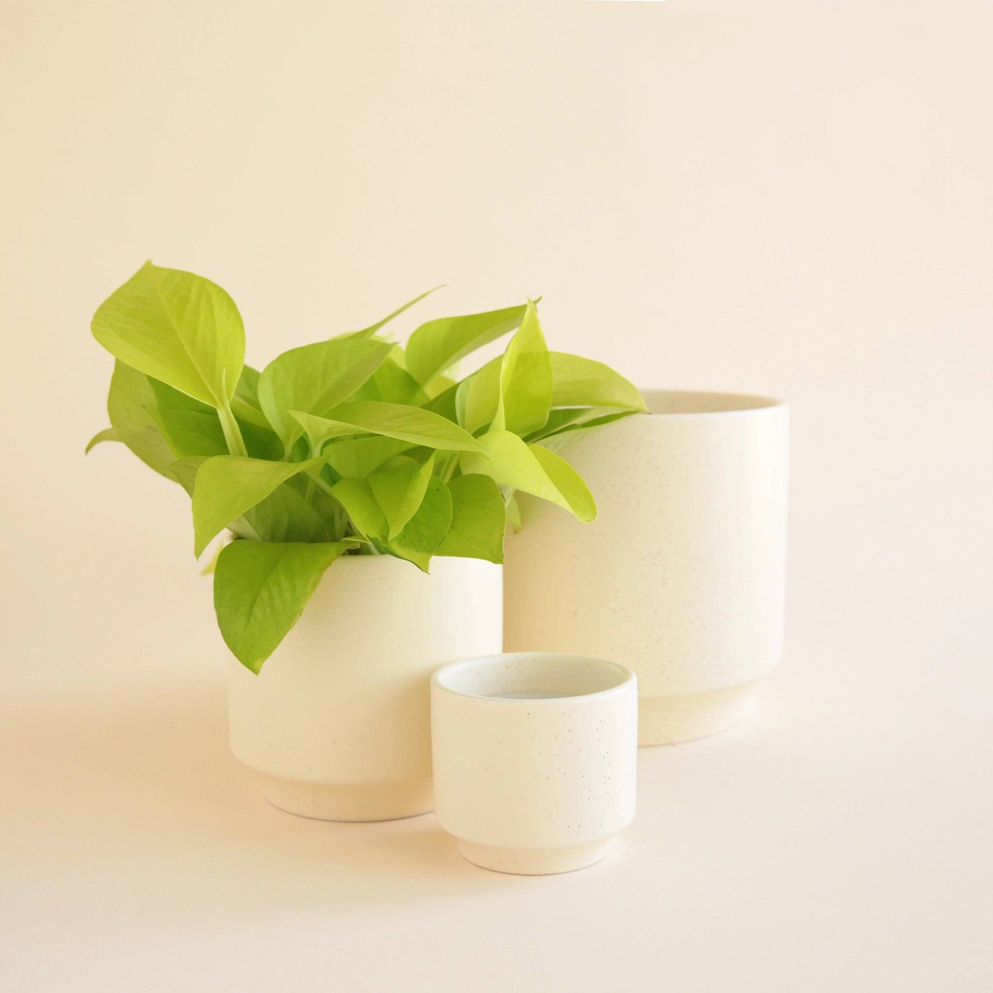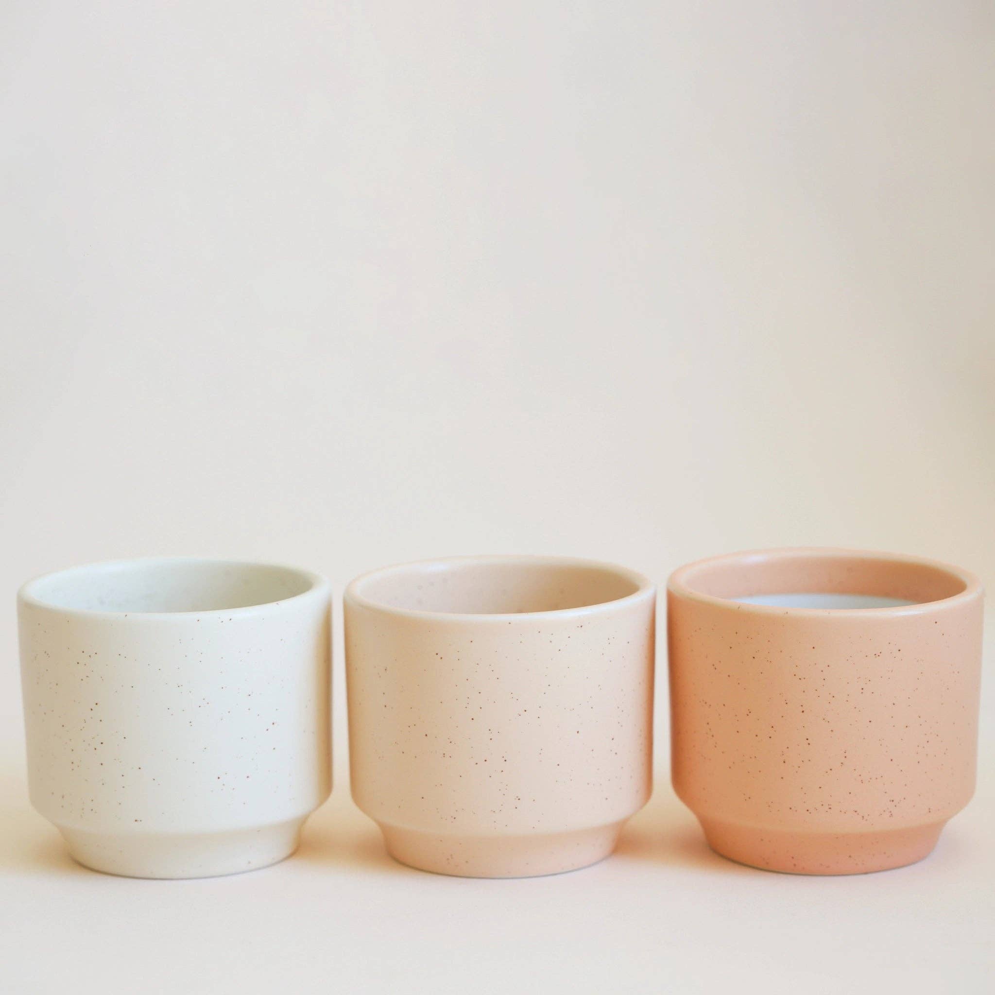 . 3" dimensions | 3" diameter x 2.75" high | fits 2.5" grow pot . 4.5" dimensions | 4.5" diameter x 4.75" high | fits 4" grow pot . 6.75" dimensions | 6.75" diameter x 6.5" high | fits 6" grow pot . Satin Glaze with Speckle finish . Includes drainage hole with plug . Packed with EPE foam - environmentally friendly and 100% recyclable . Imported