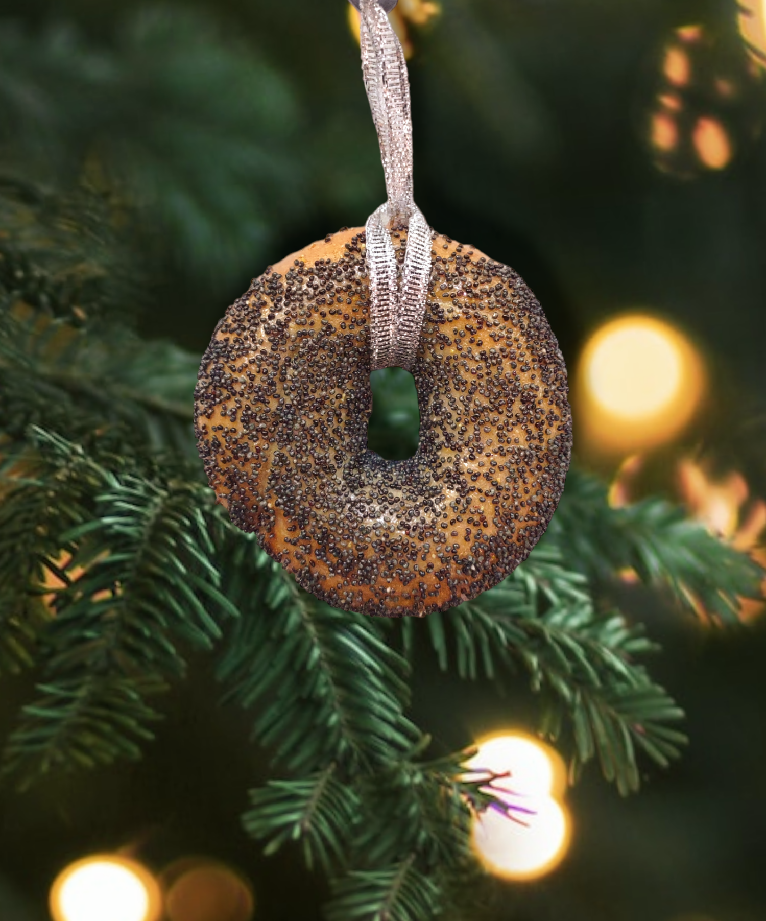 Bagel Ornaments using Real Bagels! The bagels have been half-sized from traditional bagels, formed, bathed, then decorated and baked. Once fully dehydrated, they are then sealed and shellaced. They are lightweight, solid and so darn cute! Measurements are approximate as each bagel is unique- 3" width 2.5" long Comes with silver ribbon for easy hanging. These will sell quickly, message for orders or 50.