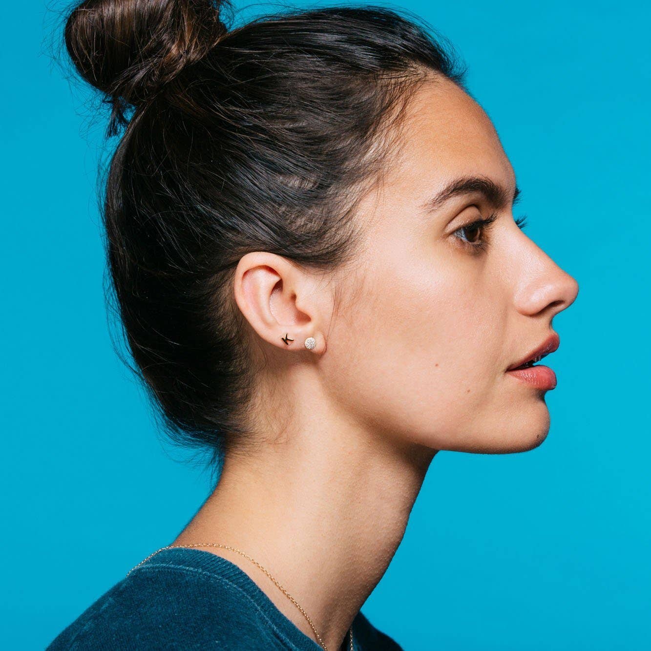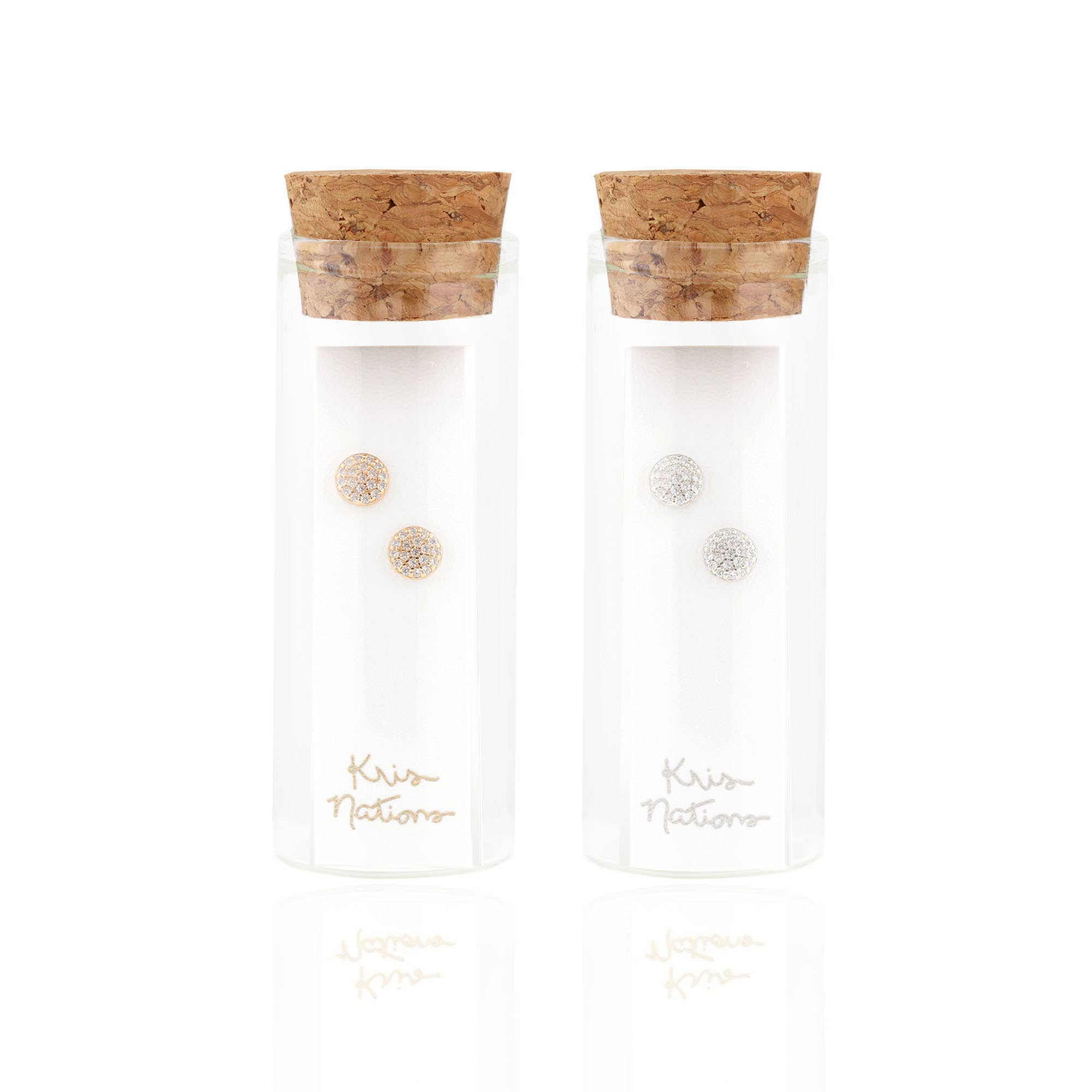 Round pave stud earrings  Studs measure approximately 0.25 inches. Available in sterling silver or 18k gold vermeil (solid sterling silver plated in 18k gold).  Set with simulated diamonds.  Packaged in our signature glass bottle.