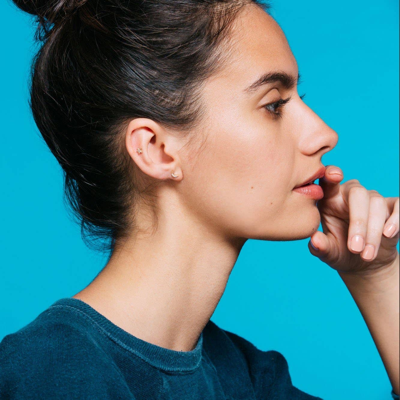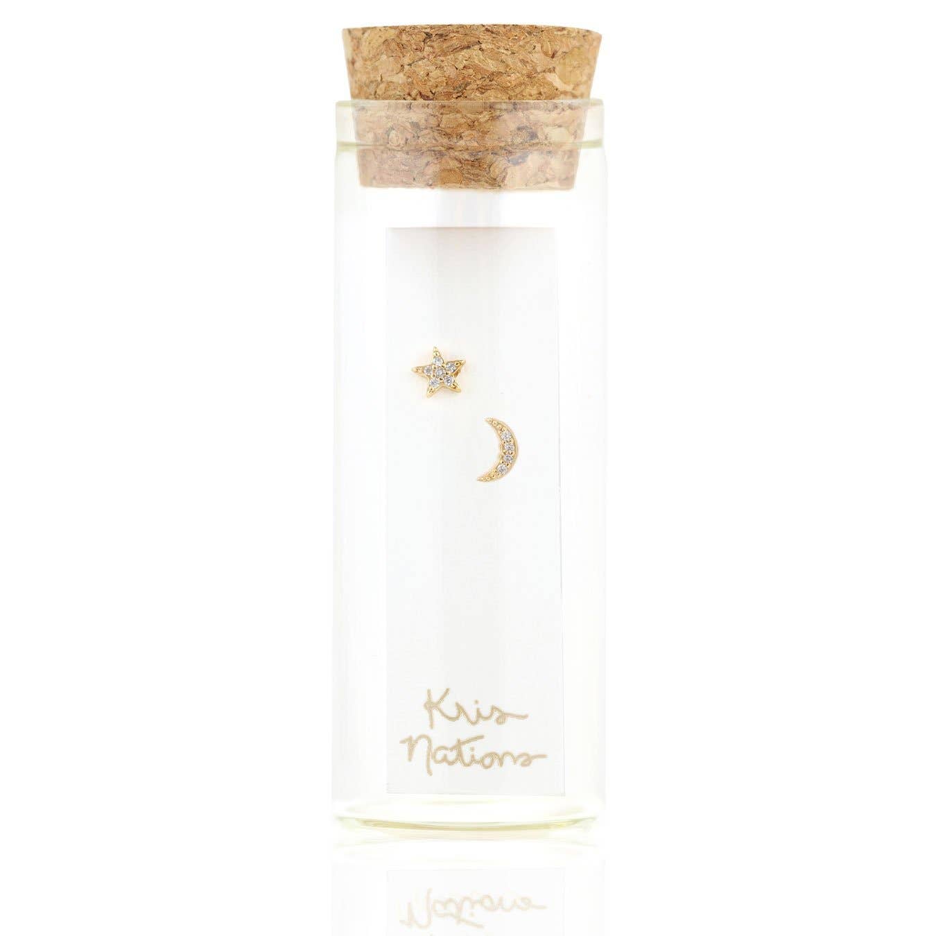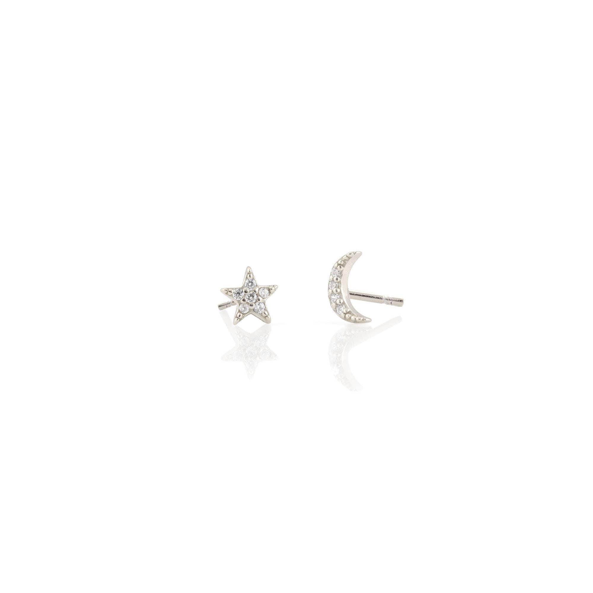 Star and Moon pave stud earrings Studs measure approximately 0.25 inches. Available in sterling silver or 18k gold vermeil (solid sterling silver plated in 18k gold).  Set with simulated diamonds.  Packaged in our signature glass bottle.