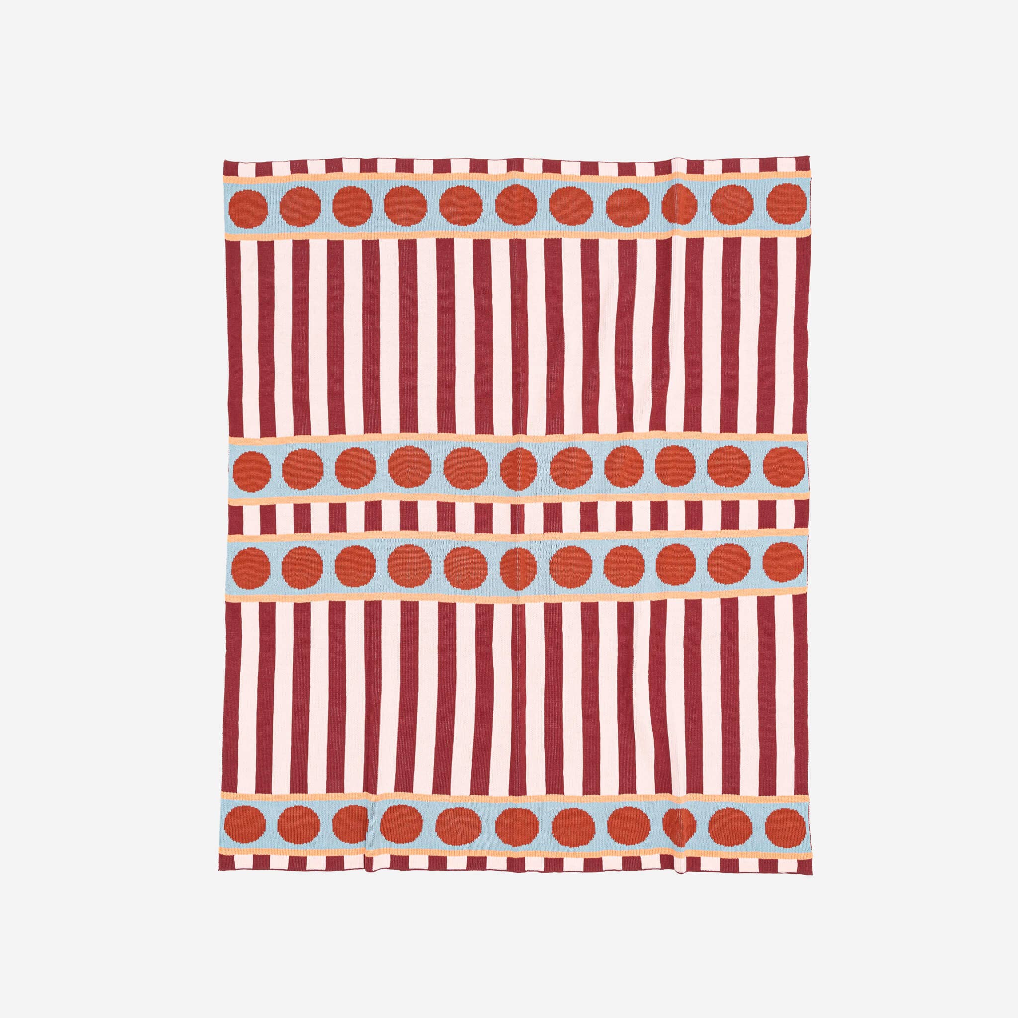 Jacquard knit throw with bold geometric circles and stripes. Mix and match with contrasting patterns or layer with a coordinating pillow for a high-impact look. Cotton-weight for year-round use. Fully reversible. Knit with new and repurposed deadstock yarn. Details 100% Acrylic Machine wash cold gentle cycle, dry flat 50"W x 60"L