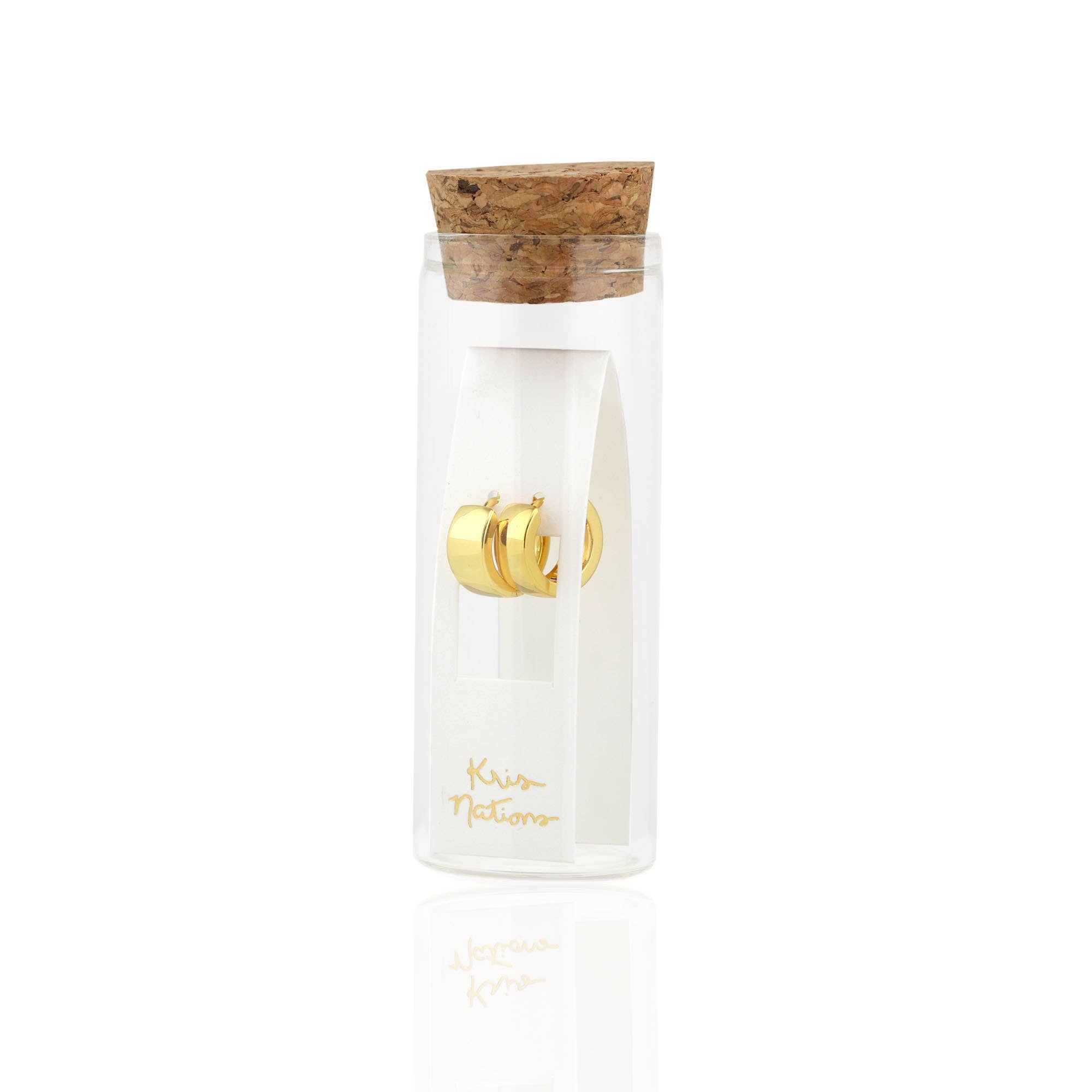 Wide Hinged Huggie Hoop Earrings Measure 12mm diameter. Hinge closure. Available in 18K gold vermeil or sterling silver. Packaged in our signature bottle.